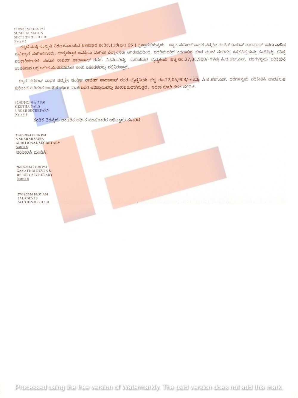 ಕನ್ನಡ ಮತ್ತು ಸಂಸ್ಕೃತಿ ಇಲಾಖೆಯ ಮೈಸೂರು ಜಿಲ್ಲೆಯ ಸಹಾಯಕ ನಿರ್ದೇಶಕರು ರಾಜೀವ್ ತಾರಾನಾಥ್ ಅವರ ಆಪ್ತರಾದ ಕೃಷ್ಣಮುನವಳ್ಳಿ ಅವರಿಂದ ಮಾಹಿತಿ ಮತ್ತು ದಾಖಲಾತಿಗಳನ್ನು ಪಡೆದಿದ್ದರು. ಅಲ್ಲದೆ 27,06,908 ರು.ಗಳ ಬಿಲ್ಗಳನ್ನು ಸಲ್ಲಿಸಿದ್ದರು. ಈ ವೆಚ್ಚವನ್ನು ಸಿಜಿಹೆಚ್ಎಸ್ ದರಗಳ ಅನ್ವಯ ಅರ್ಹ ಮೊತ್ತವನ್ನು ಅವರ ವಾರಸುದಾರರಿಗೆ ಪಾವತಿಸಲು ಸರ್ಕಾರದ ಹಂತದಲ್ಲಿ ತೀರ್ಮಾನಿಸಬೇಕು ಎಂದು ಸರ್ಕಾರಕ್ಕೆ ಕಡತವನ್ನು ಸಲ್ಲಿಸಿದ್ದರು ಎಂದು ತಿಳಿದು ಬಂದಿದೆ.