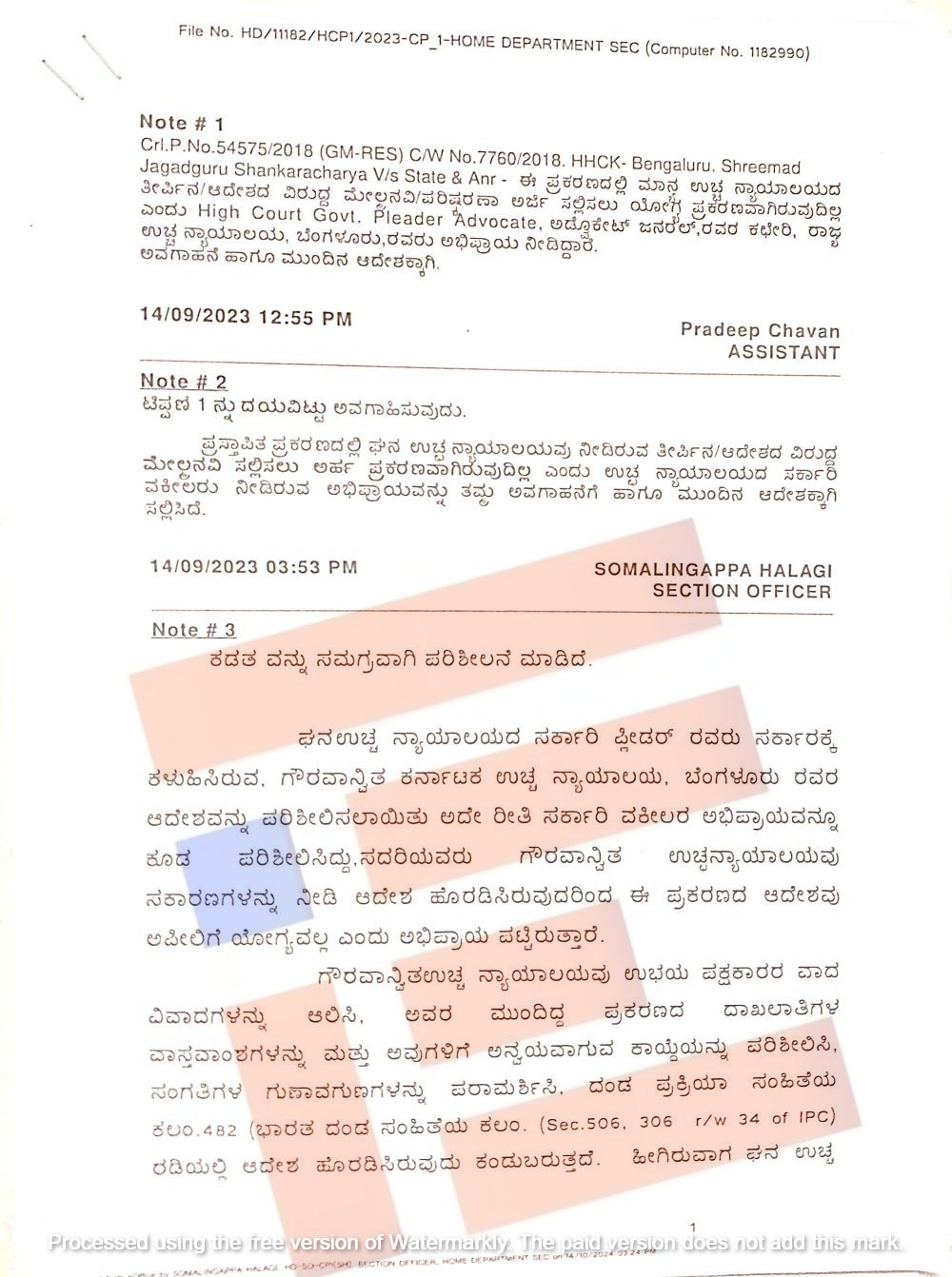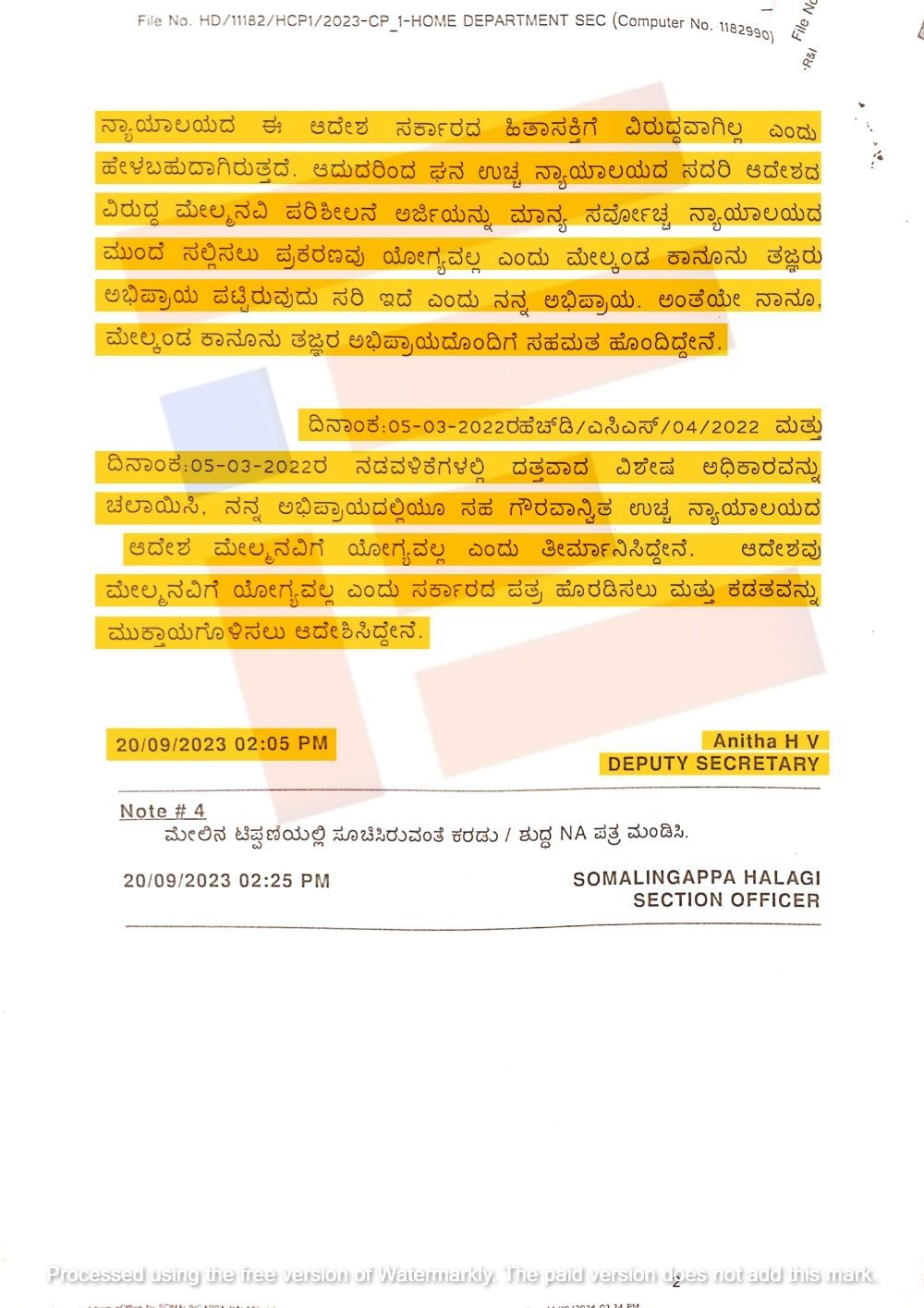 ‘ನನ್ನ ಅಭಿಪ್ರಾಯದಲ್ಲೂ ಸಹ ಉಚ್ಛ ನ್ಯಾಯಾಲಯದ ಆದೇಶವು ಮೇಲ್ಮನವಿಗೆ ಯೋಗ್ಯವಲ್ಲ ಎಂದು ತೀರ್ಮಾನಿಸಿದ್ದೇನೆ. ಆದೇಶವು ಮೇಲ್ಮನವಿಗೆ ಹೋಗ್ಯವಲ್ಲ ಎಂದು ಸರ್ಕಾರದ ಪತ್ರ ಹೊರಡಿಸಲು ಮತ್ತು ಕಡತವನ್ನು ಮುಕ್ತಾಯಗೊಳಿಸಲು ಆದೇಶಿಸಿದ್ದೇನೆ,’ ಎಂದು ಉಪ ಕಾರ್ಯದರ್ಶಿ ಅನಿತಾ ಹೆಚ್ ವಿ ಅವರು ಟಿಪ್ಪಣಿ ಹಾಳೆಯಲ್ಲಿ 2023ರ ಸೆ.20ರಂದೇ ಷರಾ ಬರೆದಿದ್ದಾರೆ.