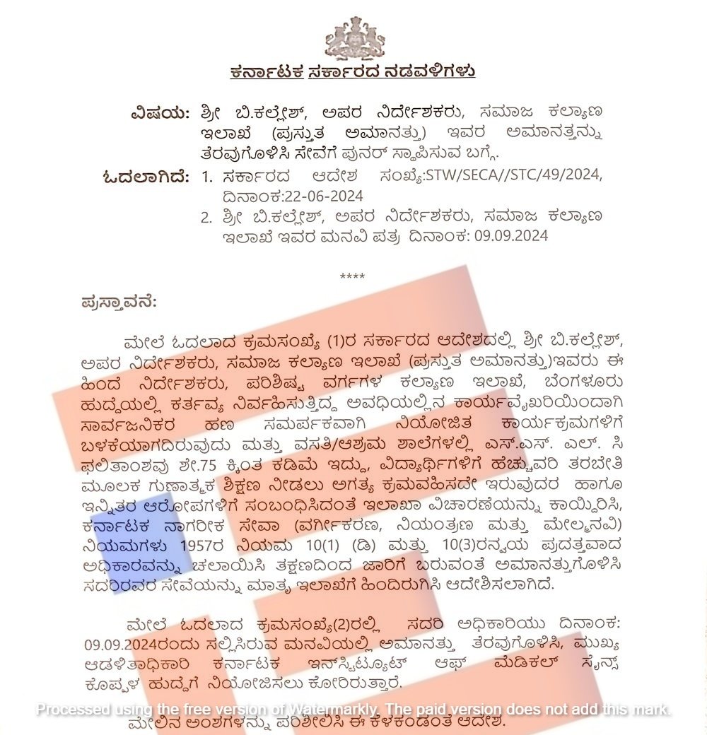 ‘ಈ ಪ್ರಸ್ತಾವನೆಯಲ್ಲಿ ವಿವರಿಸಿರುವ ಅಂಶಗಳ ಹಿನ್ನೆಲೆಯಲ್ಲಿ ಪ್ರಸ್ತುತ ಅಮಾನತಿನಲ್ಲಿರುವ ಬಿ ಕಲ್ಲೇಶ್ ಅವರನ್ನು ಕರ್ನಾಟಕ ನಾಗರೀಕ ಸೇವಾ (ವರ್ಗೀಕರಣ, ನಿಯಂತ್ರಣ ಮತ್ತು ಮೇಲ್ಮನವಿ) ನಿಯಮಗಳು 1957ರ ನಿಯಮ 10(5)(ಸಿ) ಅನ್ವಯ ಇವರ ವಿರುದ್ಧ ಇಲಾಖೆ ವಿಚಾರಣೆ ಬಾಕಿ ಇರಿಸಿ ತಕ್ಷಣದಿಂದ ಜಾರಿಗೆ ಬರುವಂತೆ ಇವರ ಅಮಾನತನ್ನು ತೆರವುಗೊಳಿಸಿ ಆದೇಶಿಸಿದೆ,’ ಎಂದು ಸಮಾಜ ಕಲ್ಯಾಣ ಇಲಾಖೆಯ ಸರ್ಕಾರದ ಅಧೀನ ಕಾರ್ಯದರ್ಶಿ ಎಲ್ ನರಸಿಂಹಮೂರ್ತಿ ಅವರು ಆದೇಶ ( ಸರ್ಕಾರದ ಆದೇಶ ಸಂಖ್ಯೆ; ಸಕಇ 242 ಪಕಸೇ 2024 (ಭಾಗ) ಬೆಂಗಳೂರು) ಹೊರಡಿಸಿತ್ತು.