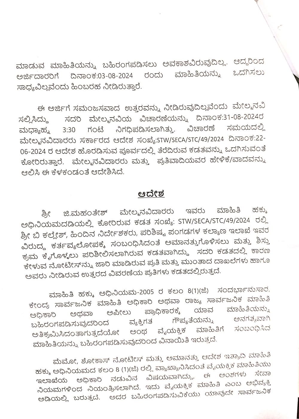 ಈ ಅರ್ಜಿಯನ್ನು ಒಂದು ತಿಂಗಳವರೆಗೂ ನಿರ್ದೇಶನಾಲಯ ಮತ್ತು ಇಲಾಖೆಯು ತನ್ನ ಬಳಿಯೇ ಇಟ್ಟುಕೊಂಡಿತ್ತು. ಇದೀಗ 2024ರ ಆಗಸ್ಟ್ 3ರಂದು ಕಡತ ಒದಗಿಸಲು ಸಾಧ್ಯವಿಲ್ಲ ಎಂದು ಹೇಳಿತ್ತು. ಇದಕ್ಕೆ ಮಾಹಿತಿ ಹಕ್ಕು ಅಧಿನಿಯಮ ಕಲಂ 8(ಹೆಚ್) ನ್ನು ಮುಂದಿರಿಸಿತ್ತು.