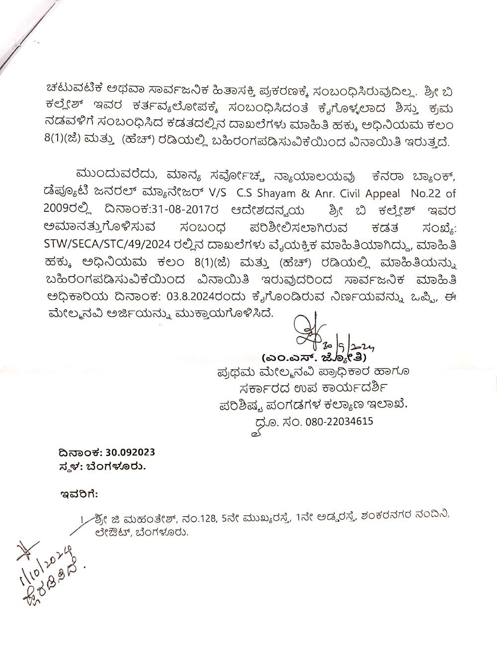 ಅಲ್ಲದೇ ಸರ್ವೋಚ್ಛ ನ್ಯಾಯಾಲಯವು ಕೆನರಾ ಬ್ಯಾಂಕ್ನ ಡೆಪ್ಯೂಟಿ ಜನರಲ್ ಮ್ಯಾನೇಜರ್ ಮತ್ತು ಸಿ ಎಸ್ ಶ್ಯಾಮ್ ಅಂಡ್ ಎಎನ್ಆರ್ ಪ್ರಕರಣ 2009ಕ್ಕೆ ಸಂಬಂಧಿಸಿದಂತೆ 2017ರ ಆಗಸ್ಟ್ 31ರಂದು ಹೊರಡಿಸಿದ್ದ ಆದೇಶದ ಅನ್ವಯ ಕಲ್ಲೇಶ್ ಅವರ ಅಮಾನತುಗೊಳಿಸುವ ಸಂಬಂಧ ಪರಿಶೀಲಿಸಿರುವ ಕಡತ (ಸಂಖ್ಯೆ STW/SECA/STC/49/2024) ದಲ್ಲಿನ ದಾಖಲೆಗಳು ವೈಯಕ್ತಿಕ ಮಾಹಿತಿಯಾಗಿದೆ ಎಂದು ಆದೇಶದಲ್ಲಿ ಉಲ್ಲೇಖಿಸಿದೆ.