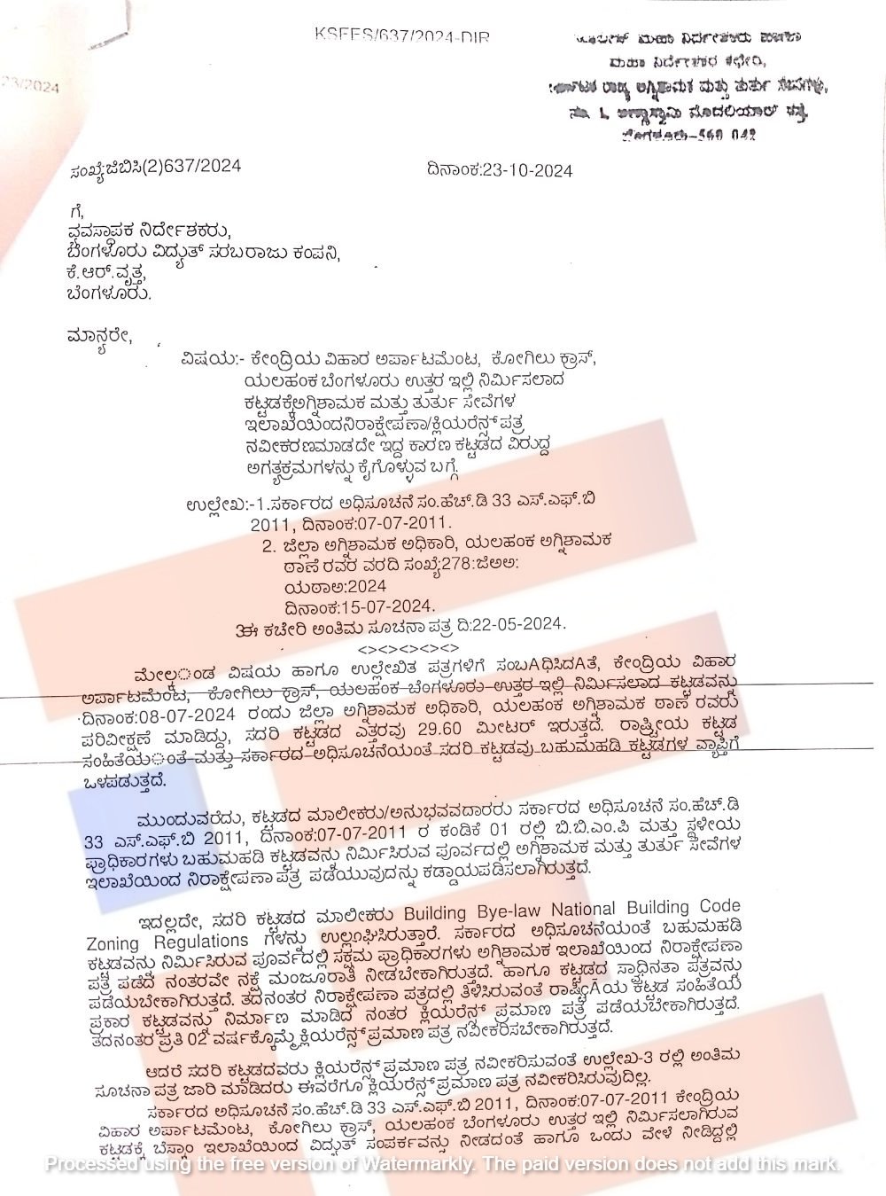 ಇದೇ ಕೇಂದ್ರೀಯ ವಿಹಾರ ಅಪಾರ್ಟ್ಮೆಂಟ್ನ ಮಾಲೀಕರು ಕಟ್ಟಡ ನಿಯಮಾವಳಿಗಳನ್ನು ಉಲ್ಲಂಘಿಸಿದ್ದಾರೆ ಎಂದು ಅಗ್ನಿಶಾಮಕ ಮತ್ತು ತುರ್ತು ಸೇವೆಗಳ ಇಲಾಖೆಯು ಸಹ ಬೆಸ್ಕಾಂಗೆ 2024ರಲ್ಲಿ ಪತ್ರ ಬರೆದಿತ್ತು.