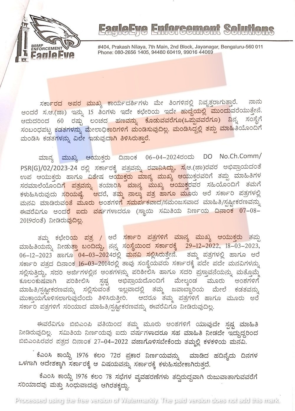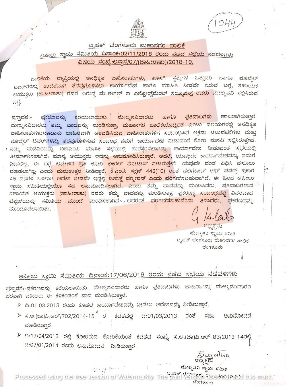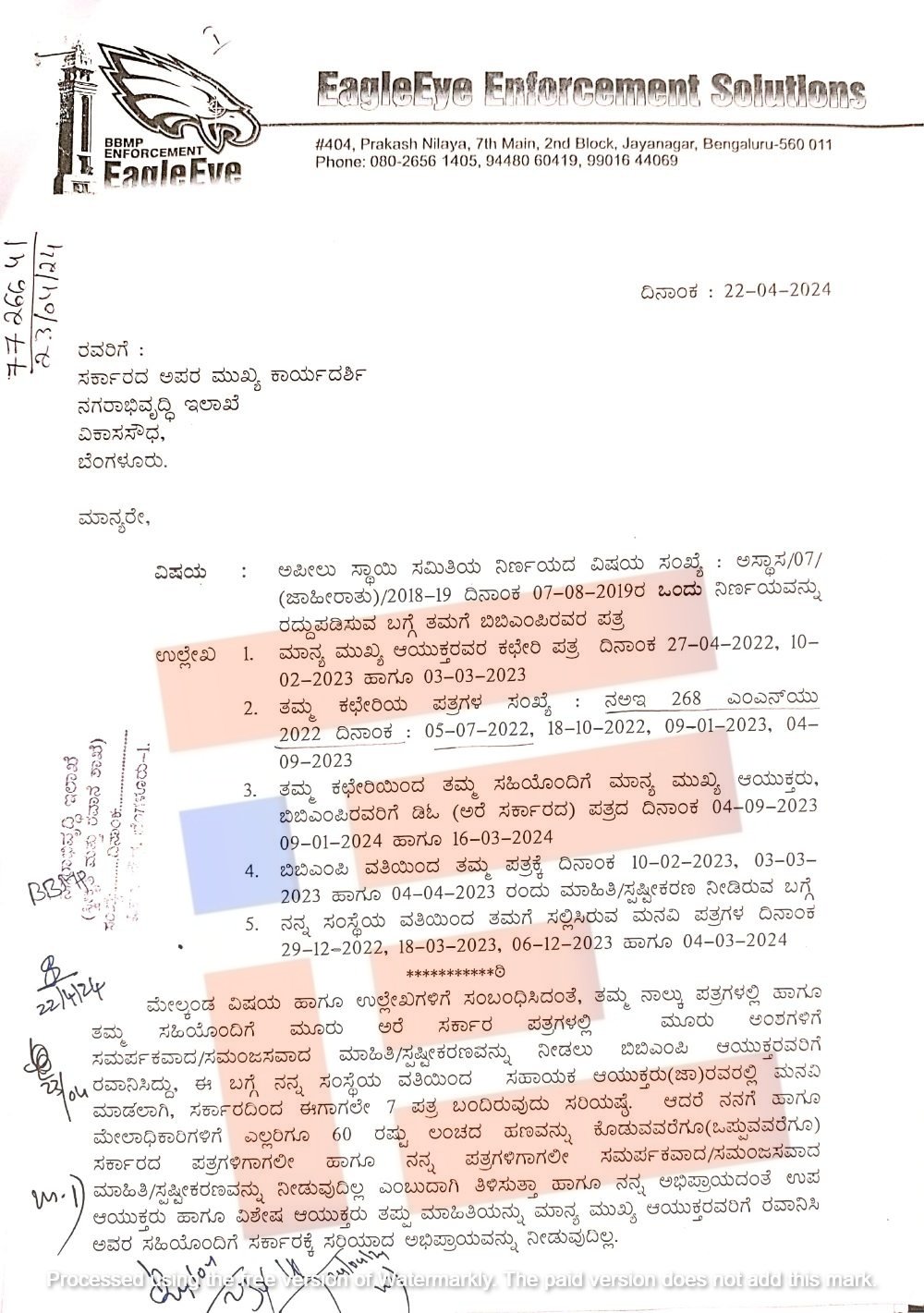 ಬಿಬಿಎಂಪಿ ವ್ಯಾಪ್ತಿಯಲ್ಲಿ ಅನಧಿಕೃತ ಜಾಹೀರಾತುಗಳು, ಖಾಸಗಿ ಸ್ವತ್ತುಗಳ ಒತ್ತುವರಿ ಹಾಗೂ ಮೊಬೈಲ್ ಟವರ್ಗಳನ್ನು ಉಚಿತವಾಗಿ ತೆರವುಗೊಳಿಸಲು ಕಾರ್ಯಾದೇಶ ನೀಡಲು ಬಿಬಿಎಂಪಿಯ ಸಹಾಯಕ ಆಯುಕ್ತರು (ಜಾಹೀರಾತು) ಕಾರ್ಯಾದೇಶ ಮತ್ತು ಮಾಹಿತಿ ನೀಡಿರಲಿಲ್ಲ. ಈ ಸಂಬಂಧ ಈಗಲ್ ಐ ಎನ್ಪೋರ್ಸ್ಮೆಂಟ್ ಸಲ್ಯೂಷನ್ಸ್ ಅವರು 2018-19ರಲ್ಲೇ ಮೇಲ್ಮನವಿ ಸಲ್ಲಿಸಿದ್ದರು.