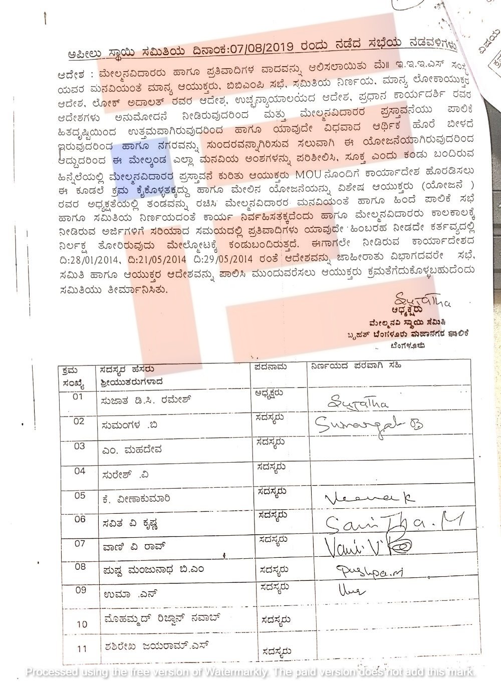‘ಮೇಲ್ಮನವಿದಾರರ ಪ್ರಸ್ತಾವನೆಯು ಪಾಲಿಕೆ ಹಿತದೃಷ್ಟಿಯಿಂದ ಉತ್ತಮವಾಗಿದೆ. ಹಾಗೂ ಯಾವುದೇ ವಿಧವಾದ ಆರ್ಥಿಕ ಹೊರೆ ಬೀಳದೇ ಇರುವುದರಿಂದ ಹಾಗೂ ನಗರವನ್ನು ಸುಂದರವನ್ನಾಗಿಸುವ ಸಲುವಾಗಿ ಈ ಯೋಜನೆ ಆಗಿರುವುದರಿಂದ ಆಯುಕ್ತರು ಎಂಒಯುನೊಂದಿಗೆ ಕಾರ್ಯಾದೇಶ ಹೊರಡಿಸಲು ಈ ಕೂಡಲೇ ಕ್ರಮ ಕೈಗೊಳ್ಳಬೇಕು,’ ಎಂದು ಬಿಬಿಎಂಪಿಯ ಮೇಲ್ಮನವಿ ಸ್ಥಾಯಿ ಸಮಿತಿಯ ಅಧ್ಯಕ್ಷರಾದ ಸುಜಾತ ಡಿ ಸಿ ರಮೇಶ್ ಅವರು ತೀರ್ಮಾನಿಸಿದ್ದರು.