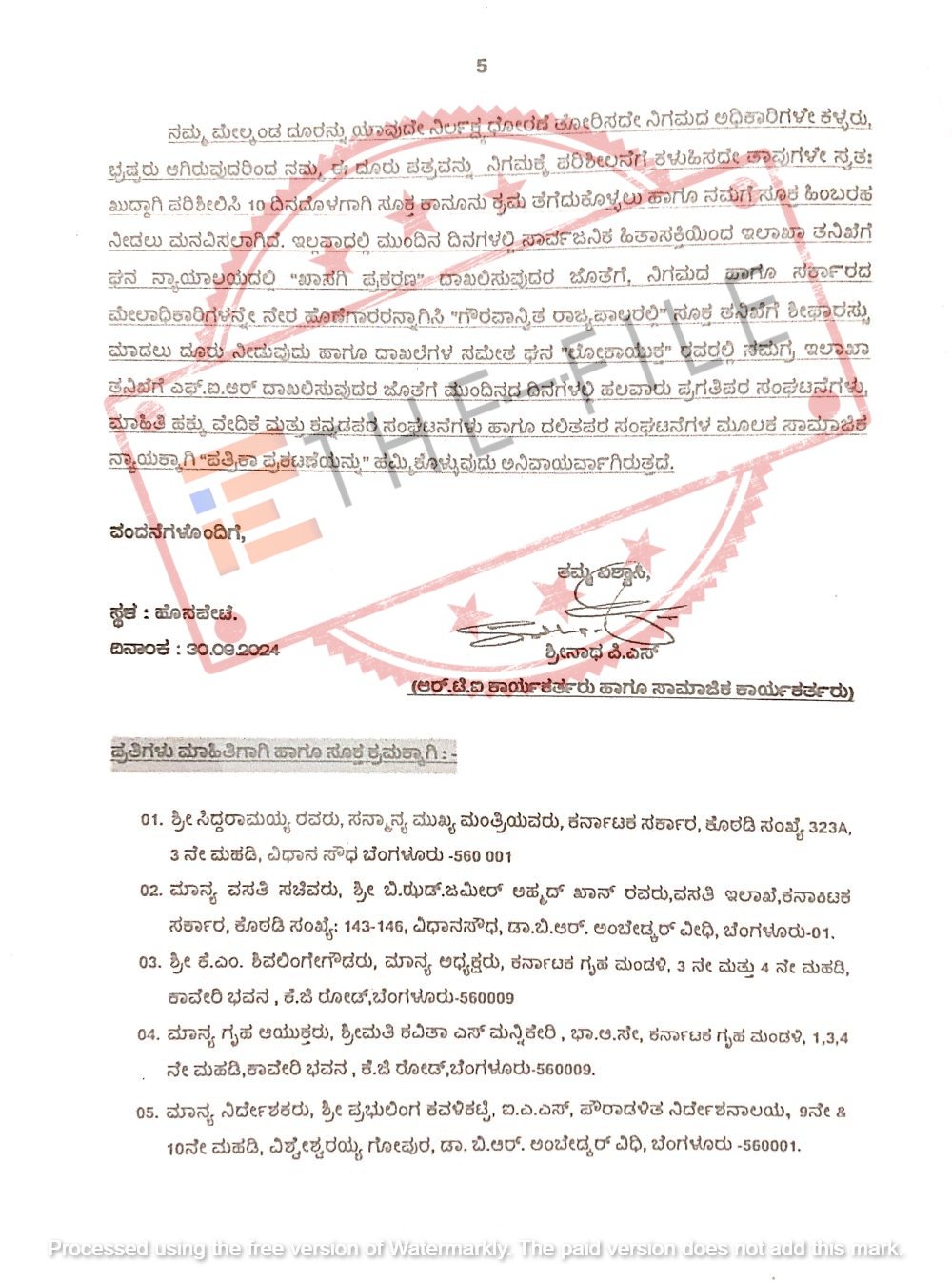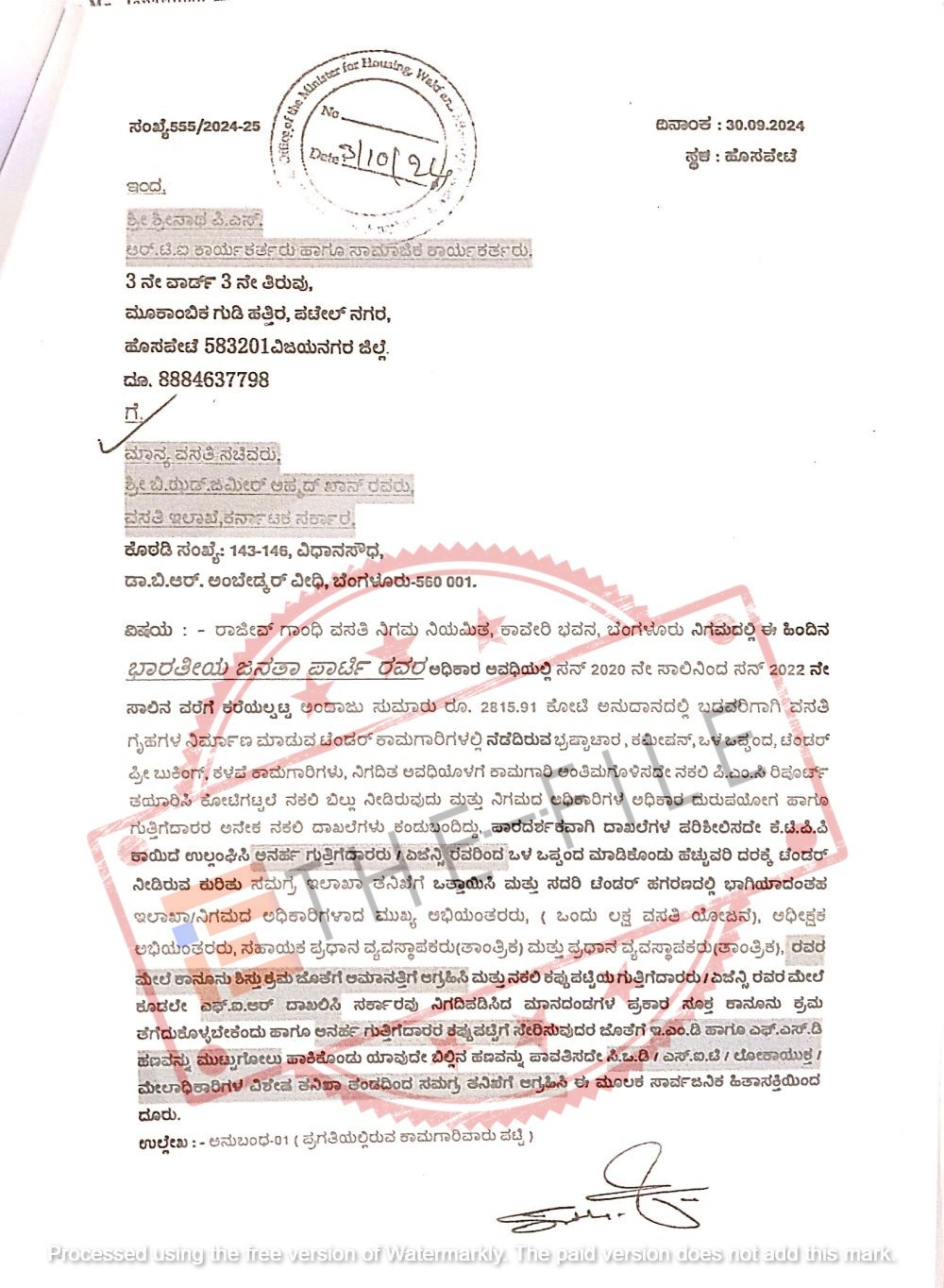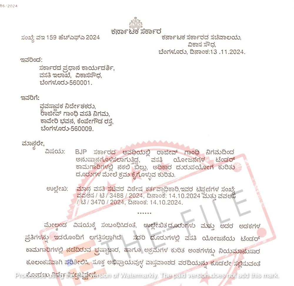 ಈ ದೂರನ್ನಾಧರಿಸಿ ವಸತಿ ಇಲಾಖೆಯು ವಾಸ್ತವಾಂಶದ ವರದಿಯನ್ನು ಕೇಳಿದೆ. ಈ ಸಂಬಂಧ ವಸತಿ ಇಲಾಖೆಯು ಸರ್ಕಾರದ ಪ್ರಧಾನ ಕಾರ್ಯದರ್ಶಿಯು ರಾಜೀವ್ಗಾಂಧಿ ವಸತಿ ನಿಗಮದ ವ್ಯವಸ್ಥಾಪಕ ನಿರ್ದೇಶಕರಿಗೆ 2024ರ ನವೆಂಬರ್ 13ರಂದು ಪತ್ರ ಬರೆದಿದ್ದಾರೆ. ಈ ಪತ್ರದ ಪ್ರತಿಯು ‘ದಿ ಫೈಲ್’ಗೆ ಲಭ್ಯವಾಗಿದೆ.