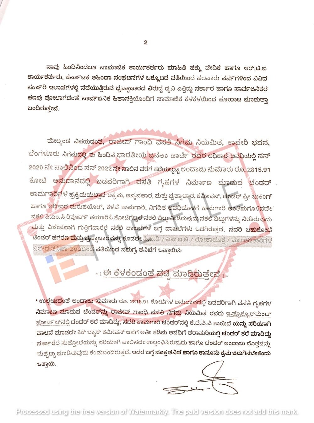 ‘ಬಿಜೆಪಿ ಸರ್ಕಾರದ ಅವಧಿಯಲ್ಲಿ ರಾಜೀವ್ಗಾಂಧಿ ನಿಗಮದಿಂದ ಅನುಷ್ಠಾನಗೊಳಿಸಲಾಗುತ್ತಿದ್ದ ವಸತಿ ಯೋಜನೆಗಳ ಟೆಂಡರ್, ಕಾಮಗಾರಿಗಳಲ್ಲಿ ಭ್ರಷ್ಟಾಚಾರ, ನಕಲಿ ಬಿಲ್, ಅಧಿಕಾರ ದುರುಪಯೋಗ ಕುರಿತು ನಿಯಮಾನುಸಾರ ಕೂಲಂಕಷವಾಗಿ ಪರಿಶೀಲಿಸಿ ಸೂಕ್ತ ಅಭಿಪ್ರಾಯಗಳೊಂದಿಗೆ ವಾಸ್ತವಾಂಶದ ವರದಿಯನ್ನು ಕೂಡಲೇ ಸಲ್ಲಿಸಬೇಕು,’ ಎಂದು ವಸತಿ ಇಲಾಖೆಯ ಸರ್ಕಾರದ ಪ್ರಧಾನ ಕಾರ್ಯದರ್ಶಿಯು ಆರ್ಜಿಹೆಚ್ಸಿಎಲ್ನ ವ್ಯವಸ್ಥಾಪಕ ನಿರ್ದೇಶಕರಿಗೆ 2024ರ ನವೆಂಬರ್ 13ರಂದು ನಿರ್ದೇಶನ ನೀಡಿರುವುದು ಗೊತ್ತಾಗಿದೆ.