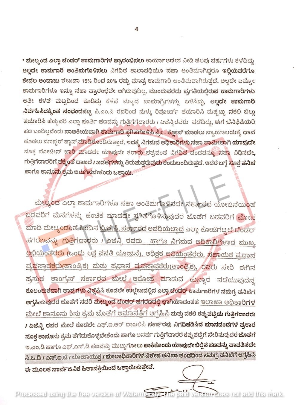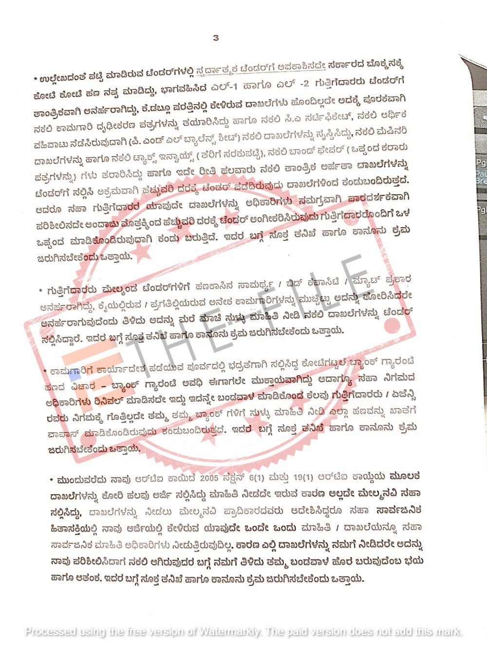 ಅದೇ ರೀತಿ ಹಲವಾರು ನಕಲಿ ತಾಂತ್ರಿಕ ಅರ್ಹತಾ ದಾಖಲೆಗಳನ್ನು ಟೆಂಡರ್ನಲ್ಲಿ ಸಲ್ಲಿಸಿದ್ದಾರೆ. ಅಕ್ರಮವಾಗಿ ಹೆಚ್ಚುವರಿ ದರಕ್ಕೆ ಟೆಂಡರ್ ಪಡೆದಿದ್ದಾರೆ. ಆದರೂ ಸಹ ಗುತ್ತಿಗೆದಾರರ ಯಾವುದೇ ದಾಖಲೆಗಳನ್ನು ಅಧಿಕಾರಿಗಳು ಸಮಗ್ರವಾಗಿ ಮತ್ತು ಪಾರದರ್ಶಕವಾಗಿ ಪರಿಶೀಲಿಸಿಲ್ಲ. ಅಂದಾಜು ಮೊತ್ತಕ್ಕಿಂತ ಹೆಚ್ಚುವರಿ ದರಕ್ಕೆ ಟೆಂಡರ್ ಅಂಗೀಕರಿಸಿದ್ದಾರೆ. ಗುತ್ತಿಗೆದಾರರಿಂದ ಒಳ ಒಪ್ಪಂದ ಮಾಡಿಕೊಂಡಿರುವುದು ಕಂಡು ಬಂದಿದೆ ಎಂದು ದೂರಿನಲ್ಲಿ ವಿವರಿಸಿರುವುದು ತಿಳಿದು ಬಂದಿದೆ.