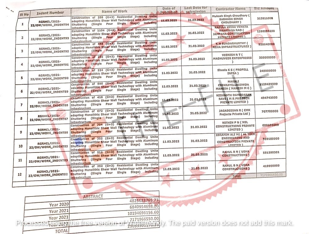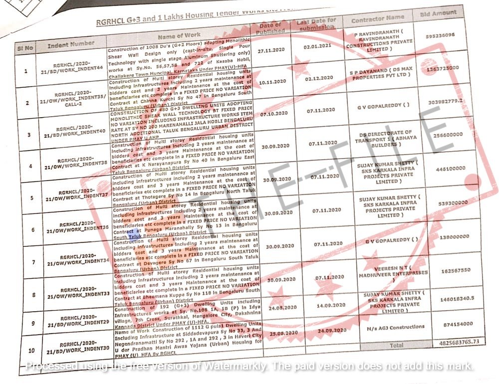 ಪಿ ರವೀಂದ್ರನಾಥ್, ಎಸ್ ಪಿ ದಯಾನಂದ್ (ಡಿ ಎಸ್ ಮ್ಯಾಕ್ಸ್), ಜಿ ವಿ ಗೋಪಾಲರೆಡ್ಡಿ, ಅಭಯ ಬಿಲ್ಡರ್ಸ್, ಎಸ್ಕೆಎಸ್ ಕಾರ್ಕಳ ಇನ್ಪ್ರಾ ಪ್ರಾಜೆಕ್ಟ್ಸ್, ಮಧುವೀರ್ ಎಂಟರ್ಪ್ರೈಸೆಸ್, ಎಜಿಜೆ ಕನ್ಸ್ಟ್ರಕ್ಷನ್ಸ್, ಉಷಾ ಕನ್ಸ್ಟ್ರಕ್ಷನ್ಸ್, ಎನ್ಎಸ್ಎಲ್ ಕನ್ಸ್ಟ್ರಕ್ಷನ್ಸ್, ಜಿವಿಆರ್ ಇನ್ಫ್ರಾಸ್ಟಕ್ಚರ್ಸ್, ಪ್ರೊಫೆಲ್, ಜಂಪನ ಕನ್ಸ್ಟ್ರಕ್ಷನ್ಸ್, ಎನ್ಸಿಸಿ ಲಿಮಿಟೆಡ್, ಮೆಕೋ ಕನ್ಸ್ಟ್ರಕ್ಷನ್ಸ್, ಬಿಎಲ್ಸಿ ಇನ್ಪ್ರಾಸ್ಟಕ್ಚರ್ ಸೇರಿದಂತೆ ಹಲವು ಗುತ್ತಿಗೆದಾರರ ಪಟ್ಟಿಯನ್ನು ಒದಗಿಸಿರುವುದು ತಿಳಿದು ಬಂದಿದೆ.