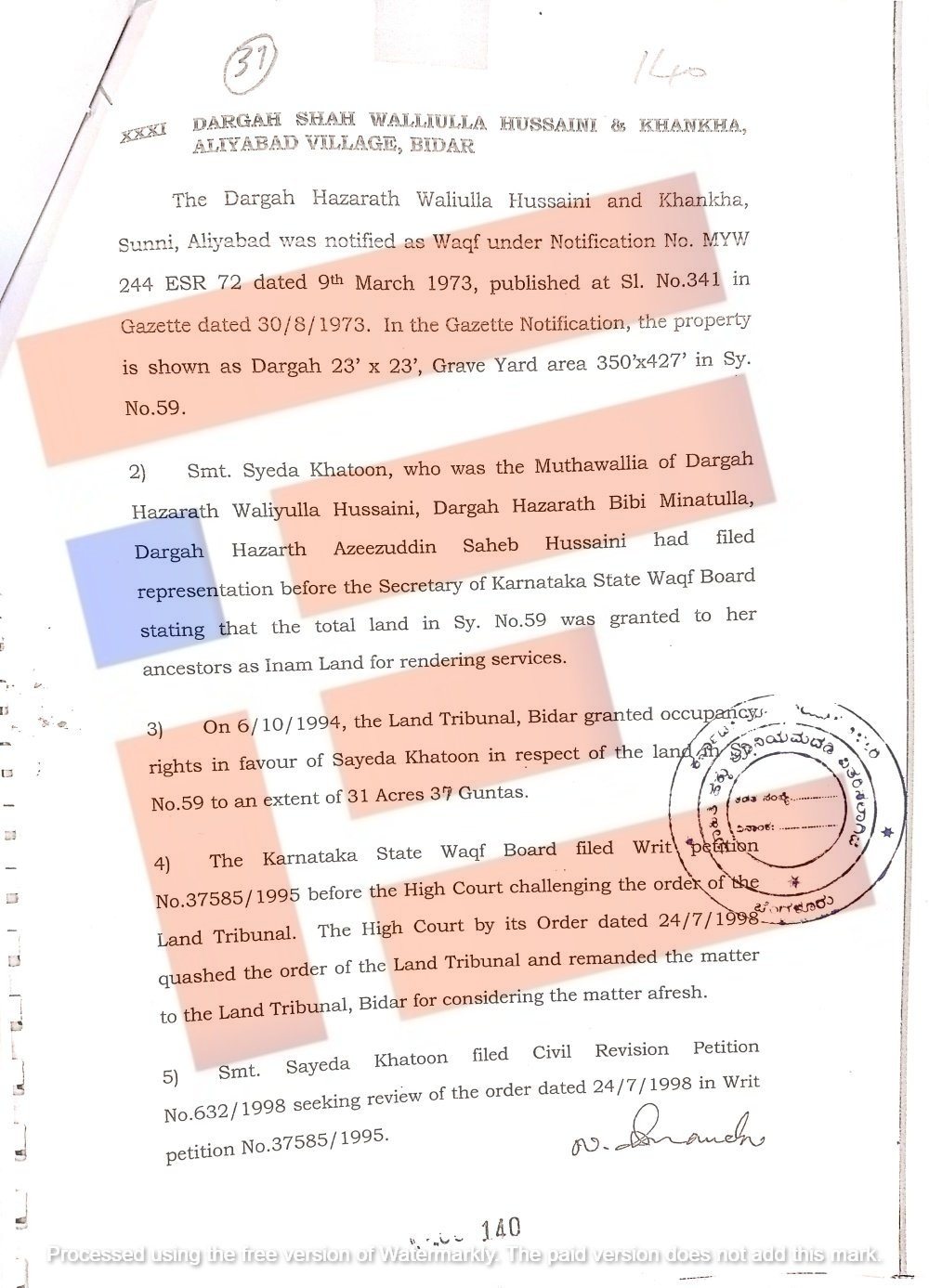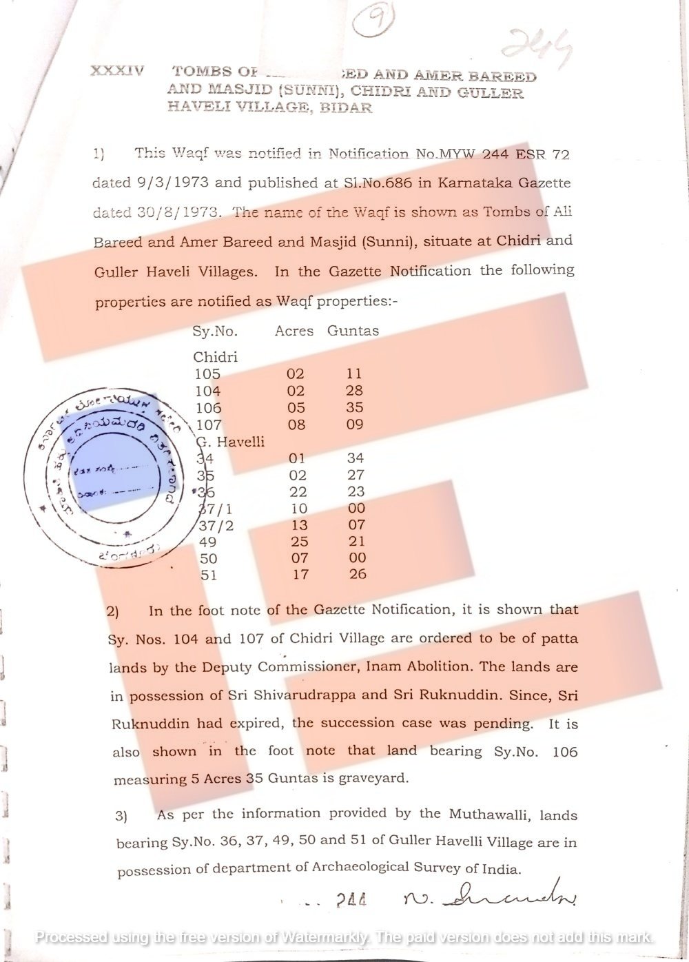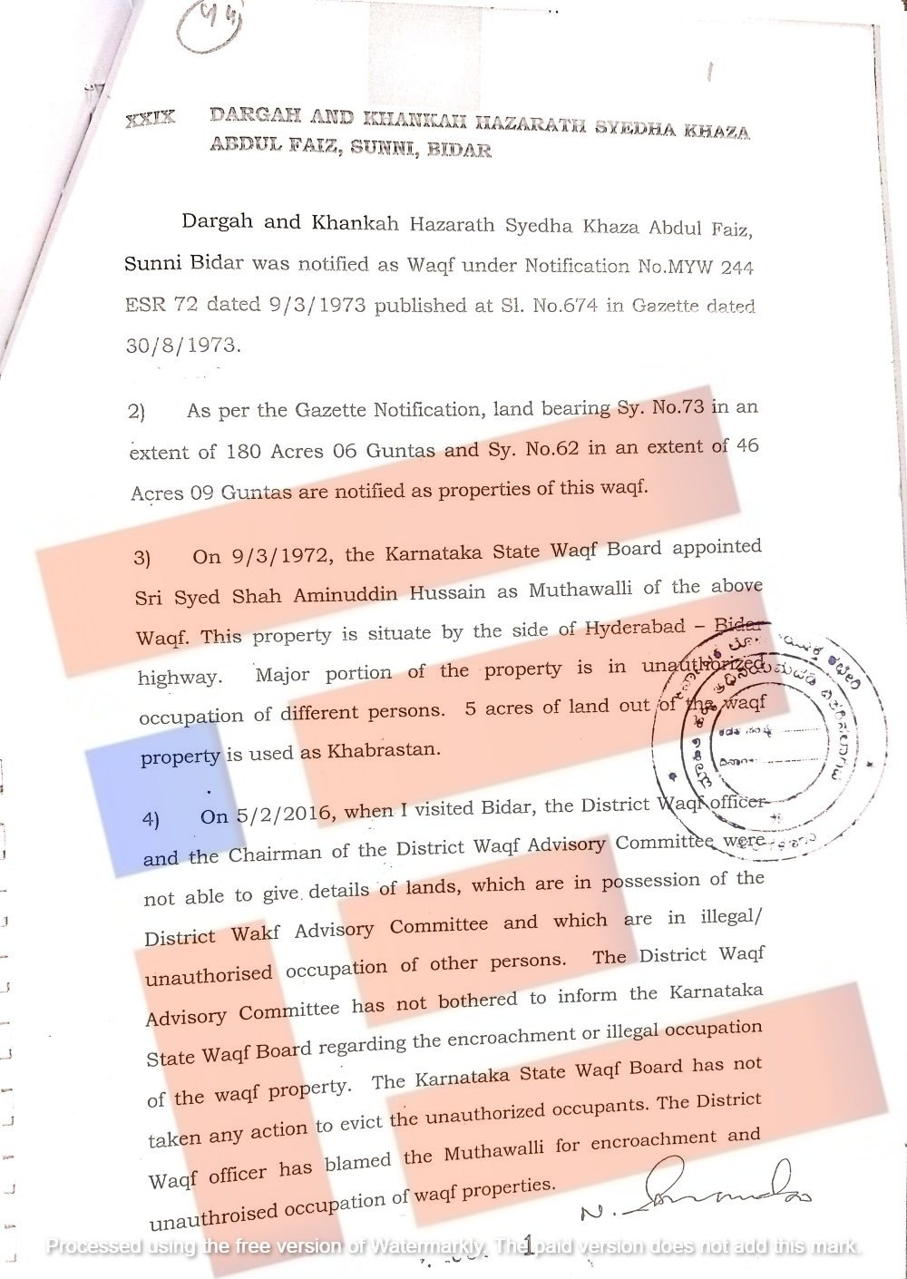ಪೊಲೀಸ್ ಕ್ವಾಟರ್ಸ್‌ಗಳಿಗಾಗಿ 6 ​​ಎಕರೆ 4 ಗುಂಟೆ ವಿಸ್ತೀರ್ಣದ ಜಮೀನಿನ ಭಾಗವನ್ನು ಸ್ವಾಧೀನಪಡಿಸಿಕೊಳ್ಳಲಾಗಿದೆ ಎಂದು ತಿಳಿಸಲಾಗಿದೆ. ಜಿಲ್ಲಾ ವಕ್ಫ್ ಅಧಿಕಾರಿಯು ಕರ್ನಾಟಕ ರಾಜ್ಯ ವಕ್ಫ್ ಮಂಡಳಿಗೆ ಪರಿಹಾರವನ್ನು ಪಾವತಿಸುವ ಬಗ್ಗೆ ಯಾವುದೇ ದಾಖಲೆಗಳನ್ನು ಸಲ್ಲಿಸಿರಲಿಲ್ಲ ಎಂಬುದು ವರದಿಯಿಂದ ಗೊತ್ತಾಗಿದೆ.