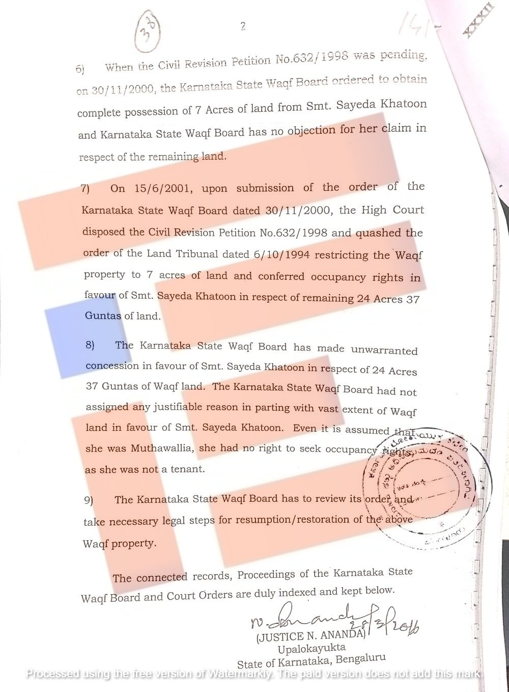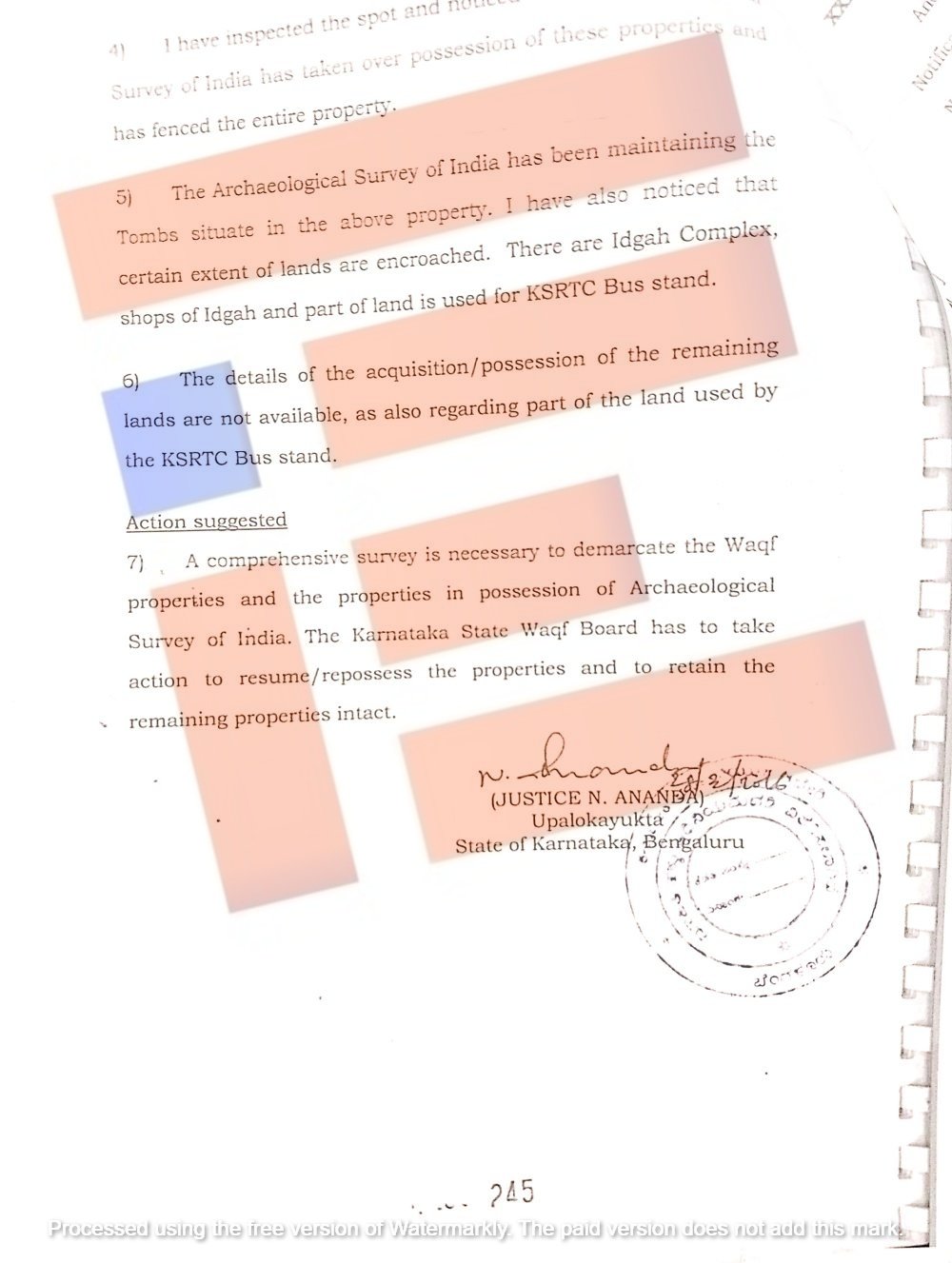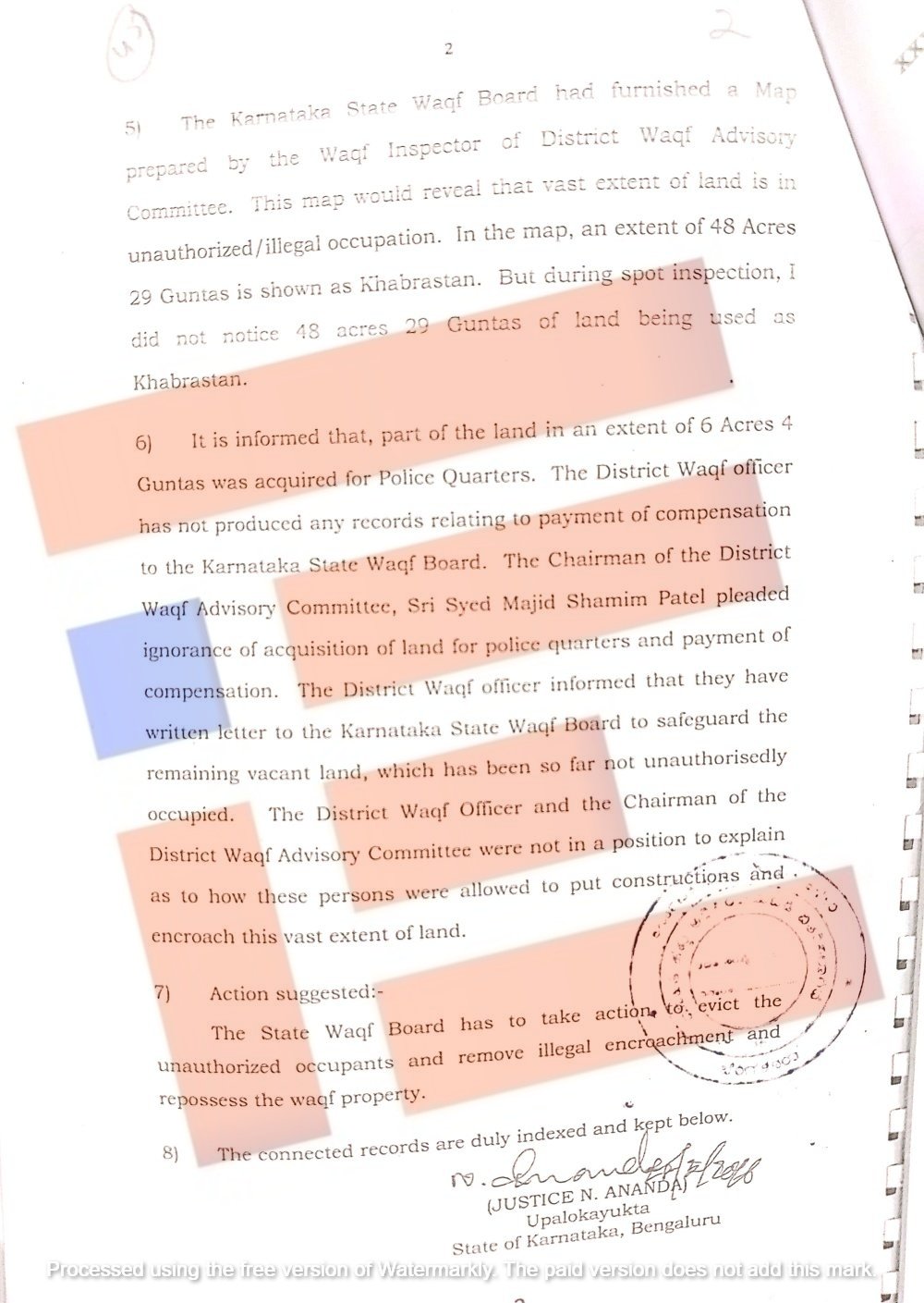 ಕರ್ನಾಟಕ ರಾಜ್ಯ ವಕ್ಫ್ ಮಂಡಳಿಯು ತನ್ನ ಆದೇಶವನ್ನು ಪರಿಶೀಲಿಸಬೇಕು. ಮತ್ತು ವಕ್ಫ್ ಆಸ್ತಿ ಎಂದು ಮರುಸ್ಥಾಪಿಸಲು ಅಗತ್ಯ ಕಾನೂನು ಕ್ರಮಗಳನ್ನು ತೆಗೆದುಕೊಳ್ಳಬೇಕು ಎಂದು ಉಪ ಲೋಕಾಯುಕ್ತ ಎನ್‌ ಆನಂದ್‌ ಅವರು ಶಿಫಾರಸ್ಸು ಮಾಡಿರುವುದು ವರದಿಯಿಂದ ಗೊತ್ತಾಗಿದೆ.