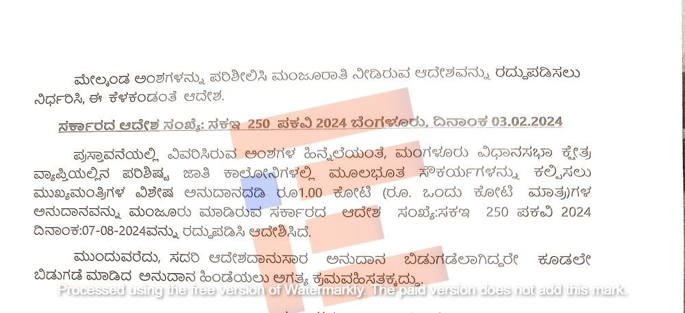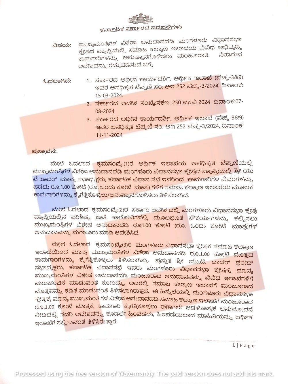 ‘ಈ ಹಿನ್ನೆಲೆಯಲ್ಲಿ ಮಂಗಳೂರು ವಿಧಾನಸಭೆ ಕ್ಷೇತ್ರಕ್ಕೆ ಮುಖ್ಯಮಂತ್ರಿಗಳ ವಿಶೇಷ ಅನುದಾನದಡಿ ಸಮಾಜ ಕಲ್ಯಾಣ ಇಲಾಖೆಗೆ ಮಂಜೂರಾದ 1.00 ಕೋಟಿ ಮೊತ್ತಕ್ಕೆ ಕಾಮಗಾರಿ ಕೈಗೆತ್ತಿಕೊಳ್ಳಲು ಈಗಾಗಲೇ ಆಡಳಿತಾತ್ಮಕ ಅನುಮೋದನೆ ನೀಡಿದಲ್ಲಿ ಈ ಆದೇಶವನ್ನು ಹಿಂಪಡೆಯಬೇಕು. ಹಿಂಪಡೆಯಲಾದ ಮಾಹಿತಿಯನ್ನು ಆರ್ಥಿಕ ಇಲಾಖೆಗೆ ಸಲ್ಲಿಸಬೇಕು,’ ಎಂದೂ ಆದೇಶದಲ್ಲಿ ಹೇಳಲಾಗಿದೆ.