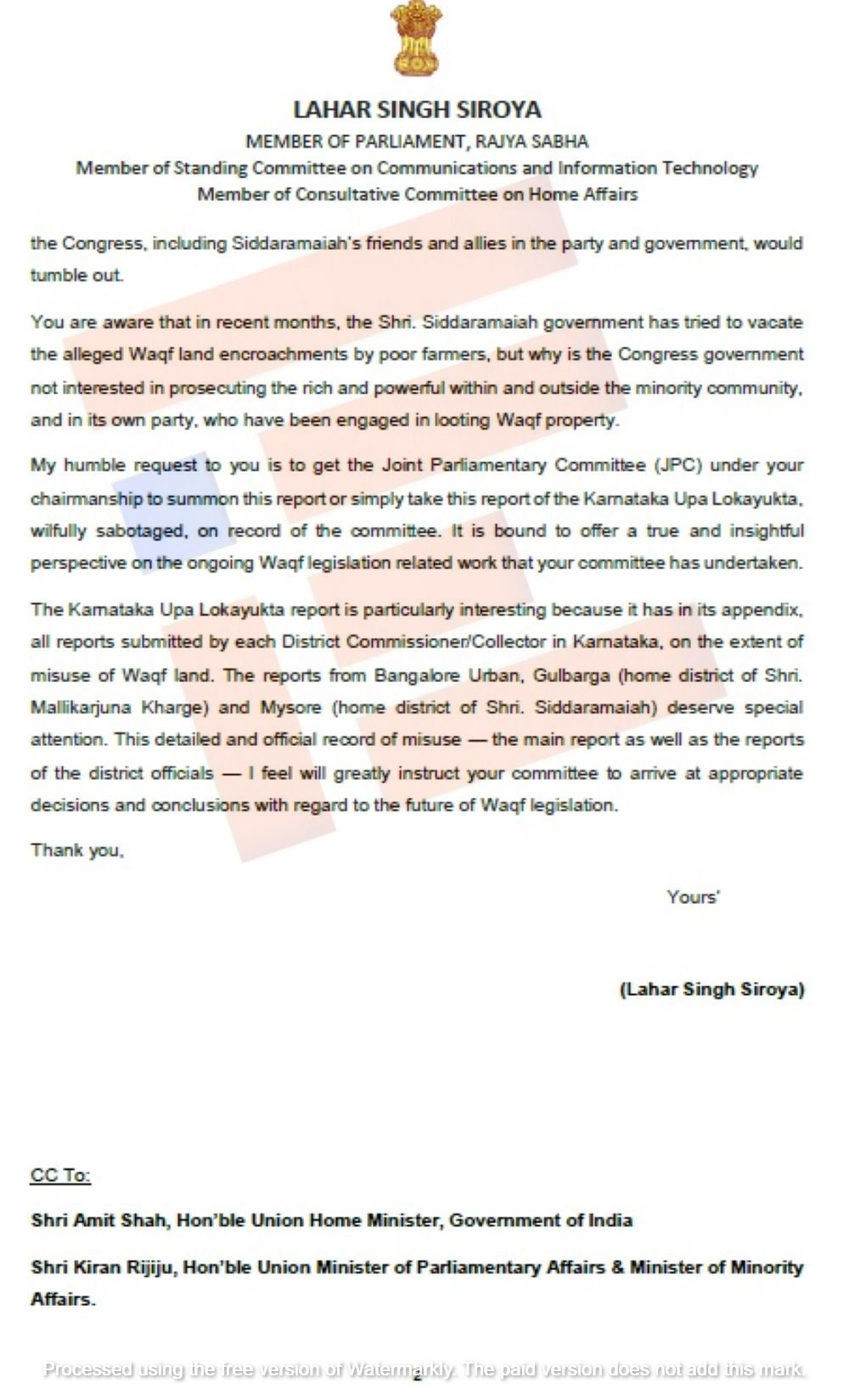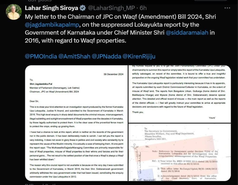 ರೈತರ ಸ್ವಾಧೀನದಲ್ಲಿದ್ದ ಆಸ್ತಿ, ಜಮೀನುಗಳನ್ನು ವಕ್ಫ್ ಆಸ್ತಿ ಎಂದು ನಮೂದಿಸಿದ್ದು ರಾಜಕೀಯ ವಲಯದಲ್ಲಿ ಸಂಚಲನ ಉಂಟು ಮಾಡಿತ್ತು. ಅಲ್ಲದೇ ಇದನ್ನೇ ಅಸ್ತ್ರವನ್ನಾಗಿ ಬಳಸಿಕೊಂಡಿದ್ದ ಪ್ರತಿಪಕ್ಷ ಬಿಜೆಪಿಯು ಕಾಂಗ್ರೆಸ್ ಮೇಲೆ ಮುಗಿಬಿದ್ದಿತ್ತು. ಈ ಬೆಳವಣಿಗೆ ನಡುವೆಯೇ ರಾಜ್ಯಸಭೆ ಸದಸ್ಯ ಲಹರ್ ಸಿಂಗ್ ಸಿರೋಯಾ ಅವರು ವಕ್ಫ್ ತಿದ್ದುಪಡಿ ಕಾನೂನು ಕುರಿತಾಗಿ ರಚಿಸಿರುವ ಜಂಟಿ ಸಂಸದೀಯ ಸಮಿತಿಗೆ ಬರೆದಿರುವ ಪತ್ರವು ಹೆಚ್ಚಿನ ಮಹತ್ವ ಪಡೆದುಕೊಂಡಿದೆ.
