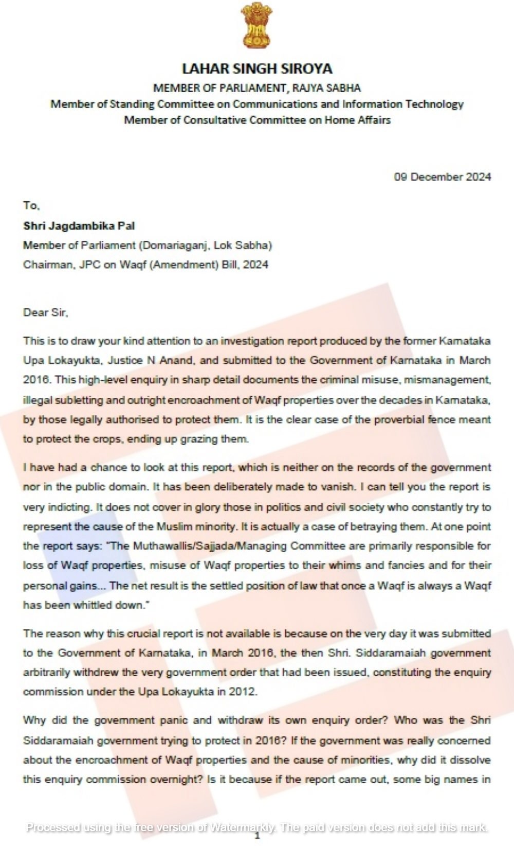 2016 ರಲ್ಲಿ ಅಂದಿನ ಉಪ ಲೋಕಾಯುಕ್ತರಾಗಿದ್ದ ನ್ಯಾ.ಆನಂದ್ ಅವರು ವಕ್ಫ್ ಆಸ್ತಿಗಳ ದುರುಪಯೋಗದ ಕುರಿತಂತೆ ನೀಡಿದ್ದ ತನಿಖಾ ವರದಿಯು ವಿವರವಾಗಿದೆ. ವಕ್ಫ್ ಆಸ್ತಿಗಳ ದುರ್ಬಳಕೆ, ಕಾನೂನು ಬಾಹಿರವಾಗಿ ಒಳಗುತ್ತಿಗೆ ನೀಡುವುದು ಹಾಗೂ ವಕ್ಫ್ ಆಸ್ತಿಗಳ ಒತ್ತುವರಿಯ ಕುರಿತು ದಾಖಲೆ ಸಮೇತ ವರದಿಯನ್ನು ನೀಡಿತ್ತು. ಬೇಲಿಯೇ ಎದ್ದು ಹೊಲ ಮೇಯ್ದಂತೆ, ವಕ್ಫ್ ಆಸ್ತಿಯನ್ನು ರಕ್ಷಿಸಬೇಕಾಗಿದ್ದ ವಕ್ಫ್ ಸಂಸ್ಥೆಯೇ ಇದರ ದುರ್ಬಳಕೆ ಮಾಡಿರುವುದನ್ನು ಉಪ ಲೋಕಾಯುಕ್ತರು ತಮ್ಮ ವರದಿಯಲ್ಲಿ ಉಲ್ಲೇಖಿಸಿದ್ದರು ಎಂದು ಪತ್ರದಲ್ಲಿ ಲಹರ್ ಸಿಂಗ್ ಅವರು ವಿವರಿಸಿರುವುದು ಗೊತ್ತಾಗಿದೆ.
