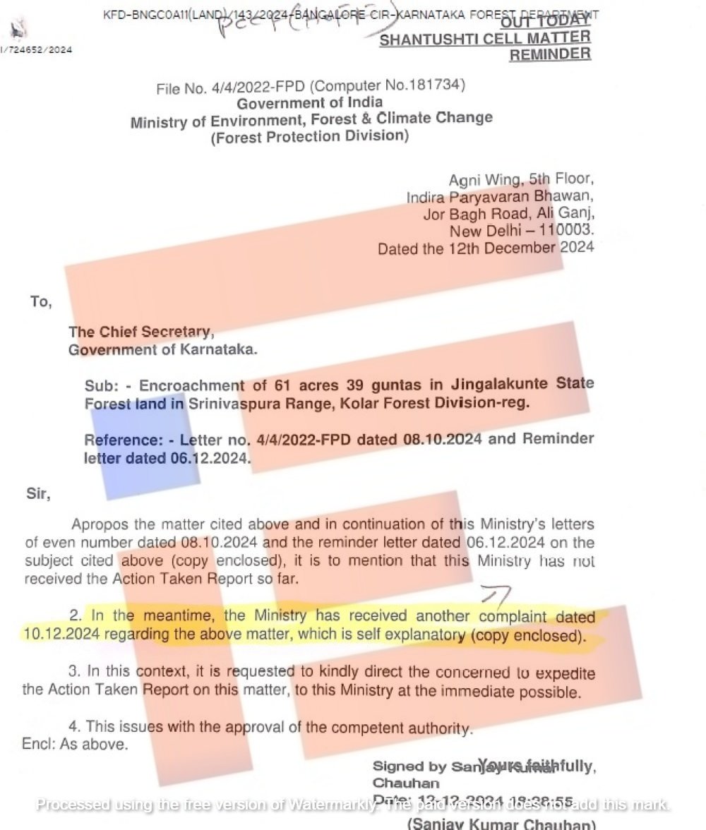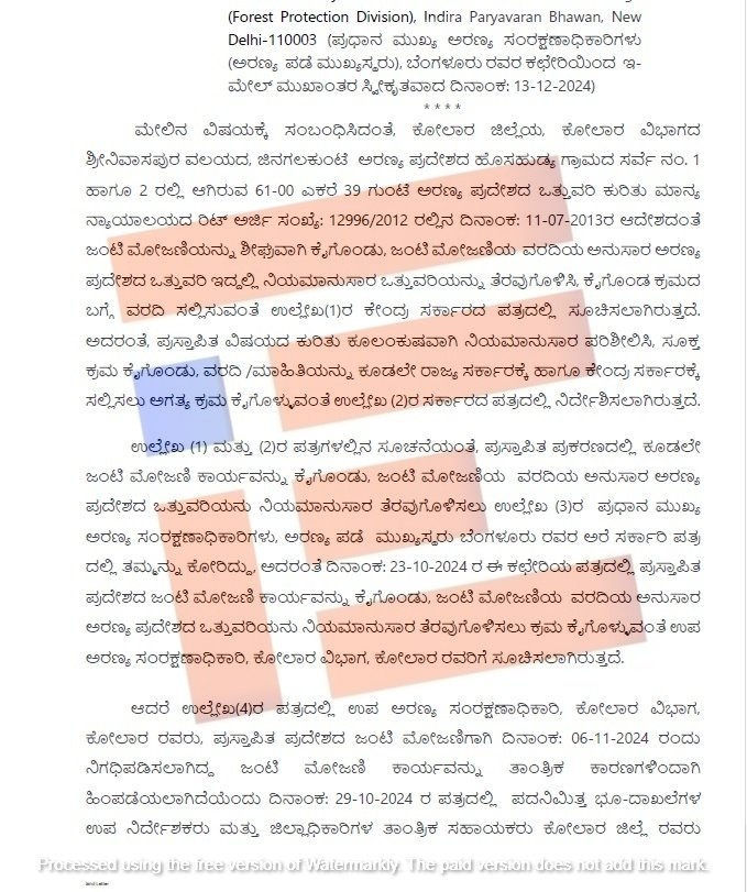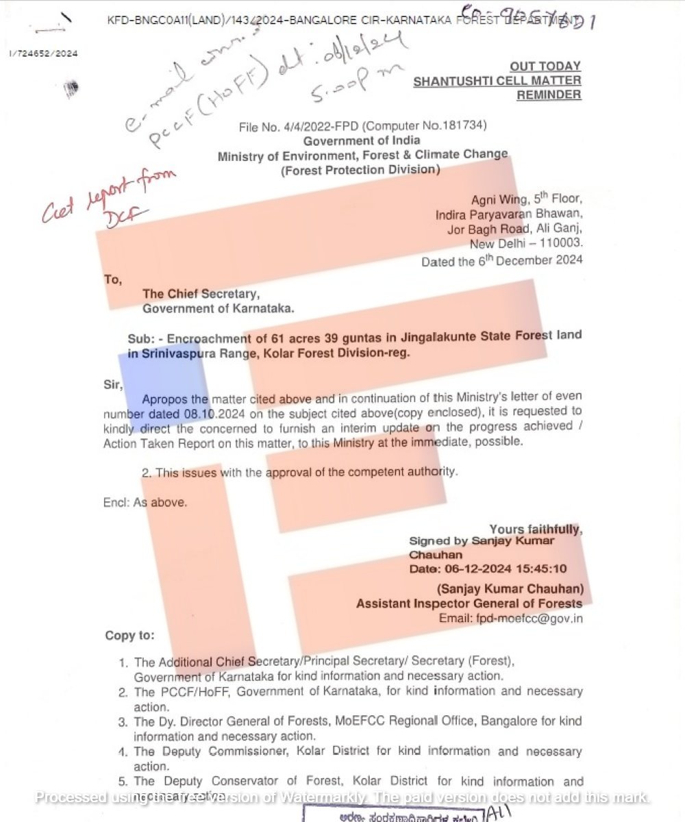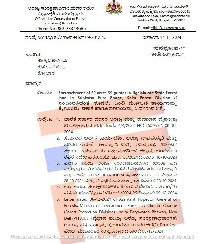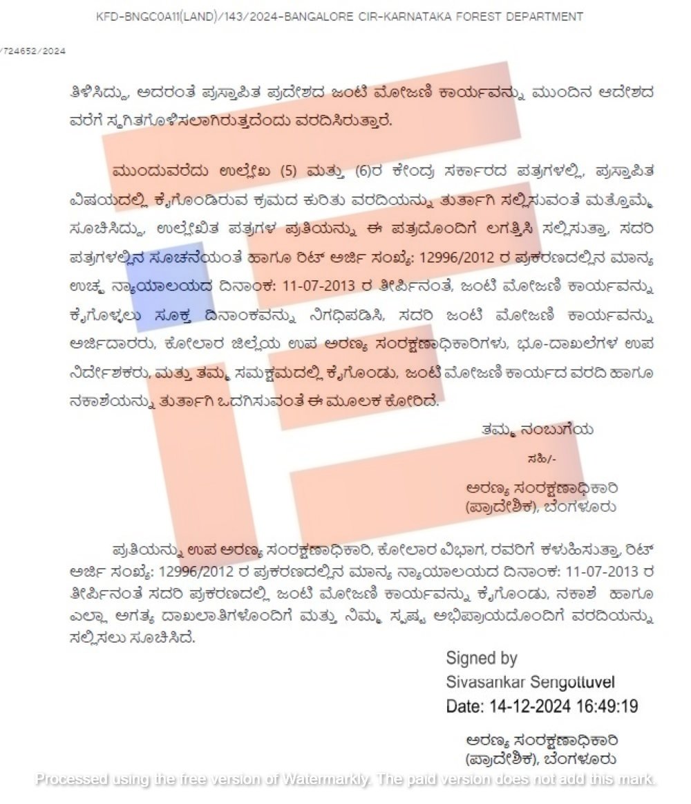 ಬೆಂಗಳೂರು ವಿಭಾಗದ ಅರಣ್ಯ ಸಂರಕ್ಷಣಾಧಿಕಾರಿಯವರು 2024ರ ಡಿಸೆಂಬರ್ 14ರಂದು ಕೋಲಾರ ಜಿಲ್ಲಾಧಿಕಾರಿಗೆ ಪತ್ರ ಬರೆದಿದ್ದಾರೆ. ಈ ಪತ್ರದ ಪ್ರತಿಯು ‘ದಿ ಫೈಲ್’ಗೆ ಲಭ್ಯವಾಗಿದೆ.