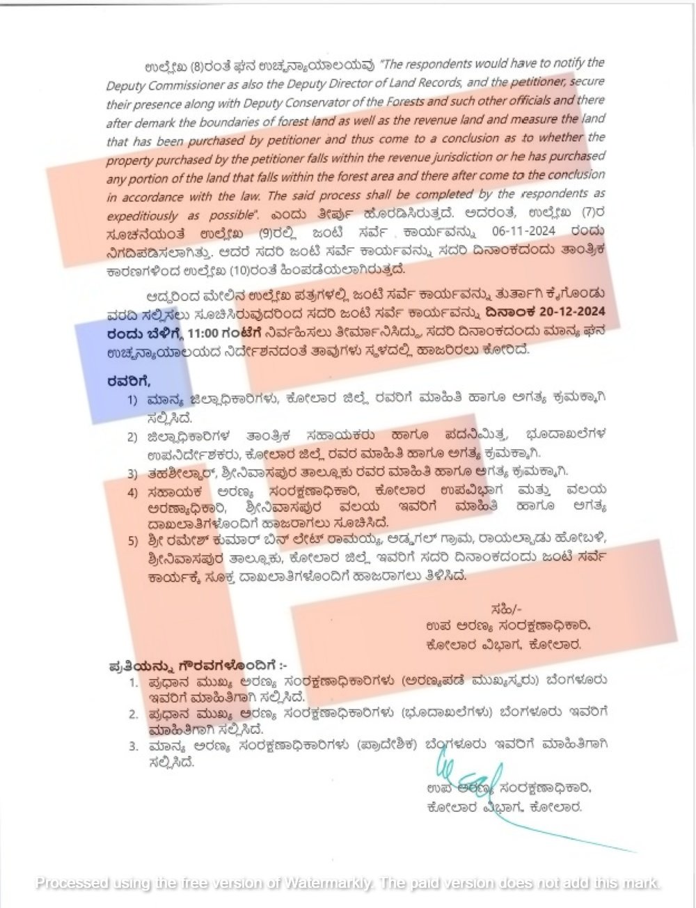 ಕೋಲಾರ ವಿಭಾಗದ ಉಪ ಅರಣ್ಯ ಸಂರಕ್ಷಣಾಧಿಕಾರಿಯವರು 2024ರ ನವೆಂಬರ್ 6ರಂದು ಜಂಟಿ ಸರ್ವೆಗೆ ದಿನಾಂಕ ನಿಗದಿಪಡಿಸಿದ್ದರು. ಆದರೆ ತಾಂತ್ರಿಕ ಕಾರಣಗಳಿಂದ ಅದನ್ನು ಹಿಂಪಡೆದುಕೊಂಡಿತ್ತು. ಅಲ್ಲದೇ ಪ್ರಸ್ತಾಪಿತ ಪ್ರದೇಶದ ಜಂಟಿ ಮೋಜಣಿ ಕಾರ್ಯವನ್ನು ಮುಂದಿನ ಆದೇಶದವರೆಗೆ ಸ್ಥಗಿತಗೊಳಿಸಲಾಗಿದೆ ಎಂದು ಭೂ ದಾಖಲೆಗಳ ಸಹಾಯಕ ನಿರ್ದೇಶಕರು ಸಹ ವರದಿ ಮಾಡಿದ್ದರು.