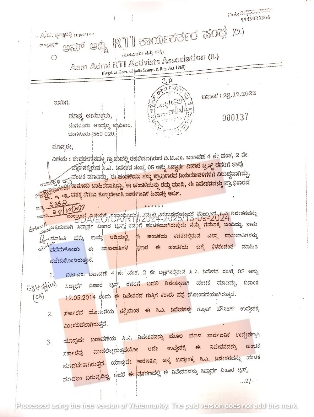 ಹಾಗೆಯೇ ಇದೇ ಸಿಎ ನಿವೇಶನವನ್ನು ಸಿದ್ದಾರ್ಥ ವಿಹಾರ ಟ್ರಸ್ಟ್ಗೆ ಹಂಚಿಕೆ ಮಾಡಿರುವುದು ಕಾನೂನುಬಾಹಿರವಾಗಿದೆ ಎಂದು 2022ರಲ್ಲೇ ಬಿಡಿಎ ಆಯುಕ್ತರಿಗೆ ದೂರು ಕೂಡ ಸಲ್ಲಿಸಲಾಗಿತ್ತು. ಎ ಜಿ ಕೃಷ್ಣಾರೆಡ್ಡಿ ಎಂಬುವರು ದೂರು ಸಲ್ಲಿಸಿದ್ದರು.