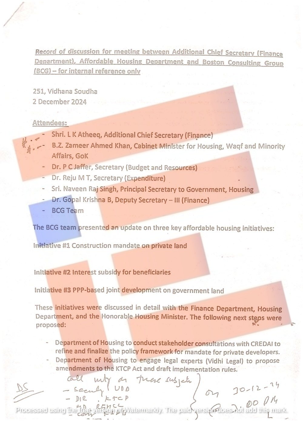 ವಿಶೇಷವೆಂದರೇ ಇಂತಹದೊಂದು ಯೋಜನಾ ಮಾದರಿಗಳನ್ನು ಸರ್ಕಾರದ ಮುಂದಿಟ್ಟಿರುವುದು ಬೋಸ್ಟನ್ ಕನ್ಸಲ್ಟಿಂಗ್ ಗ್ರೂಪ್‌ (ಬಿಸಿಜಿ) .  ಸರ್ಕಾರಿ ಜಾಗಗಳಲ್ಲಿ ವಸತಿ ಯೋಜನೆಗಳನ್ನು ಅನುಷ್ಠಾನಗೊಳಿಸುವ ಸಂಬಂಧ ವಸತಿ ಇಲಾಖೆಯ ಸಚಿವ ಬಿ ಝಡ್ ಜಮೀರ್ ಅಹ್ಮದ್ ಖಾನ್,  ಆರ್ಥಿಕ ಇಲಾಖೆಯ ಸರ್ಕಾರದ ಮುಖ್ಯ ಕಾರ್ಯದರ್ಶಿ ಎಲ್ ಕೆ ಅತೀಕ್‌ ಅವರು ವಸತಿ ಇಲಾಖೆ ಮತ್ತು ಬೋಸ್ಟನ್ ಕನ್ಸಲ್ಟಿಂಗ್ ಗ್ರೂಪ್‌ (ಬಿಸಿಜಿ) ನೊಂದಿಗೆ ಆಂತರಿಕವಾಗಿ ಸಮಾಲೋಚನೆ ನಡೆಸಿದ್ದರು.