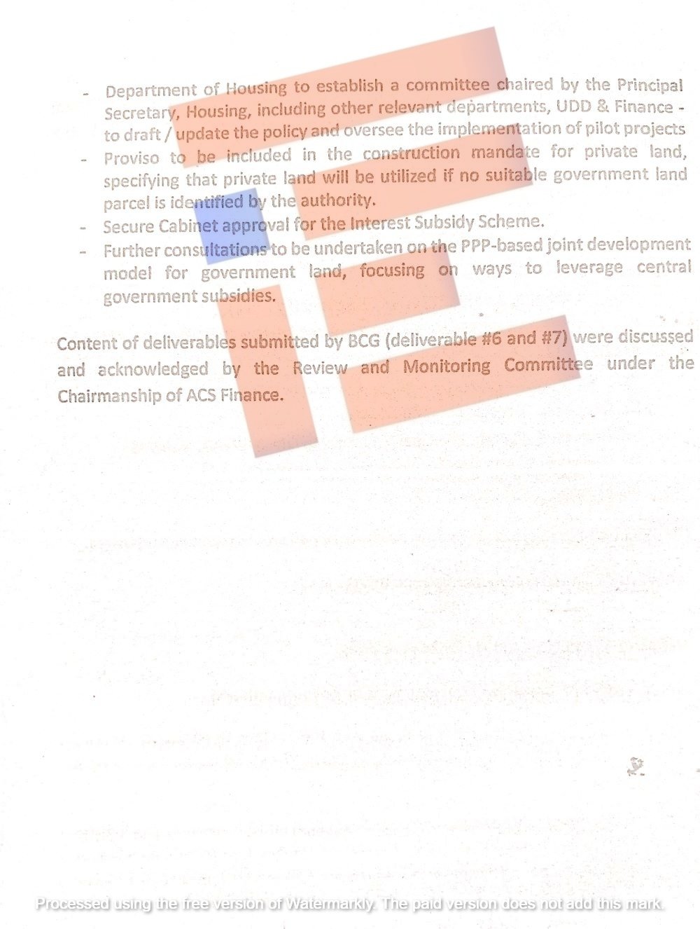 ವಸತಿ ಇಲಾಖೆಯು ಪ್ರಧಾನ ಕಾರ್ಯದರ್ಶಿಯವರ ಅಧ್ಯಕ್ಷತೆಯಲ್ಲಿ ಸಮಿತಿ ರಚಿಸಬೇಕು. ಈ ಸಮಿತಿಯಲ್ಲಿ ನಗರಾಭಿವೃದ್ಧಿ ಮತ್ತು ಆರ್ಥಿಕ ಇಲಾಖೆಯ ಅಧಿಕಾರಿಗಳಿರಬೇಕು. ಈ ಸಮಿತಿಯು ಪೈಲಟ್‌ ಯೋಜನೆಗಳ ಅನುಷ್ಠಾನ ಮತ್ತು ಮೇಲ್ವಿಚಾರಣೆ ನಡೆಸಬೇಕು. ಪ್ರಾಧಿಕಾರವು ಯಾವುದೇ ಸೂಕ್ತವಾದ ಸರ್ಕಾರಿ ಭೂಮಿಯನ್ನು ಗುರುತಿಸದಿದ್ದರೆ ಖಾಸಗಿ ಭೂಮಿಯನ್ನು ಬಳಸಿಕೊಳ್ಳಲಾಗುವುದು ಎಂದು ಈ ಸಮಿತಿಯು ನಿರ್ದಿಷ್ಟಪಡಿಸಬೇಕು ಎಂದು ಶಿಫಾರಸ್ಸು ಮಾಡಿದೆ.