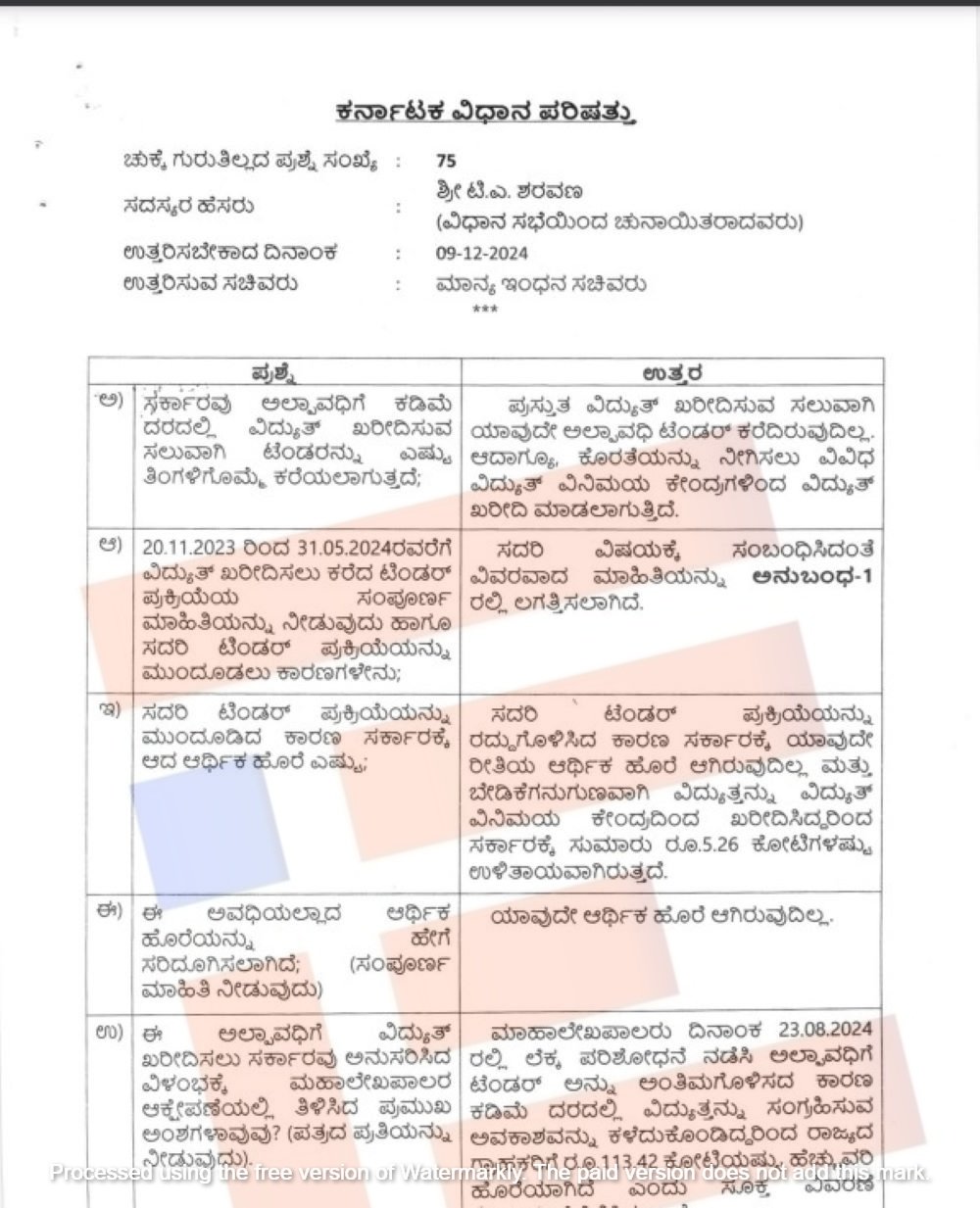 ಇದೇ ವರದಿಗೆ ಪೂರಕವಾಗಿ ವಿಧಾನ ಪರಿಷತ್ ಸದಸ್ಯ ಜೆಡಿಎಸ್ನ ಟಿ ಎ ಶರವಣ ಅವರು ಚುಕ್ಕೆ ಗುರುತಿಲ್ಲದ ಪ್ರಶ್ನೆ ಕೇಳಿದ್ದರು. ಇದಕ್ಕೆ 2024ರ ಡಿಸೆಂಬರ್ 9ರಂದು ಉತ್ತರ ನೀಡಿರುವ ಇಂಧನ ಸಚಿವ ಕೆ ಜೆ ಜಾರ್ಜ್ ಅವರು ಟೆಂಡರ್ ಪ್ರಕ್ರಿಯೆಯನ್ನು ರದ್ದುಗೊಳಿಸಿರುವುದರಿಂದ ಯಾವುದೇ ರೀತಿಯ ಆರ್ಥಿಕ ಹೊರೆ ಆಗಿರುವುದಿಲ್ಲ ಎಂದು ಉತ್ತರಿಸಿದ್ದಾರೆ.