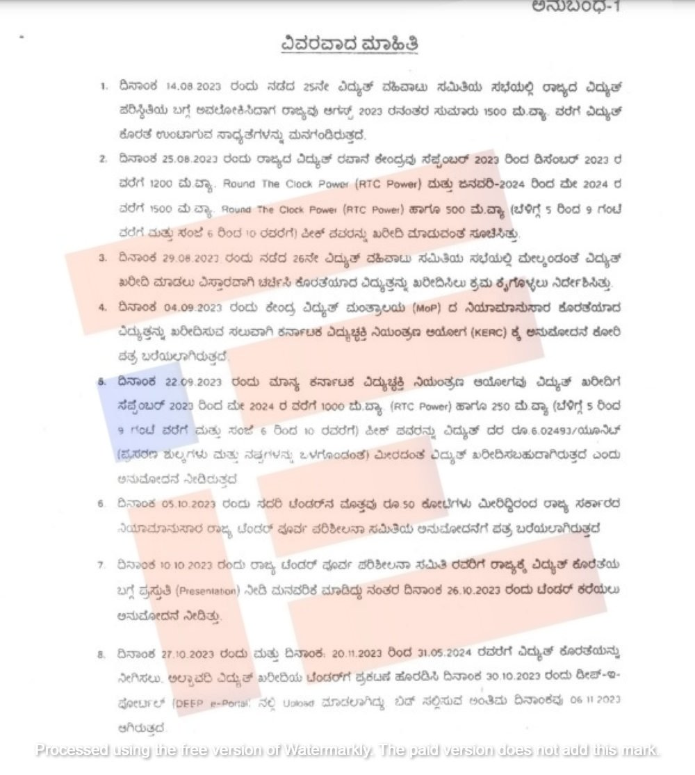 ಸೆ.2023ರಿಂದ ಡಿಸೆಂಬರ್ 23ರವರೆಗೆ 1,200 ಮೆಗಾ ವ್ಯಾಟ್ ಮತ್ತು ಜನವರಿ 2024ರಿಂದ ಮೇ 2024ರವರೆಗೆ 1,500 ಮೆಗಾವ್ಯಾಟ್ ಹಾಗೂ 500 ಮೆಗಾ ವ್ಯಾಟ್ಗಳಿಗೆ (ಬೆಳಿಗ್ಗೆ 5ರಿಂದ 9 ಗಂಟೆ)ವರೆಗೆ ಮತ್ತು ಸಂಜೆ 6ರಿಂದ 10ರವರೆಗೆ ಪೀಕ್ ಪವರ್ನ್ನು ಖರೀದಿ ಮಾಡಲು ಸೂಚಿಸಿತ್ತು ಎಂದು ಉತ್ತರದಲ್ಲಿ ವಿವರಿಸಿರುವುದು ಗೊತ್ತಾಗಿದೆ.