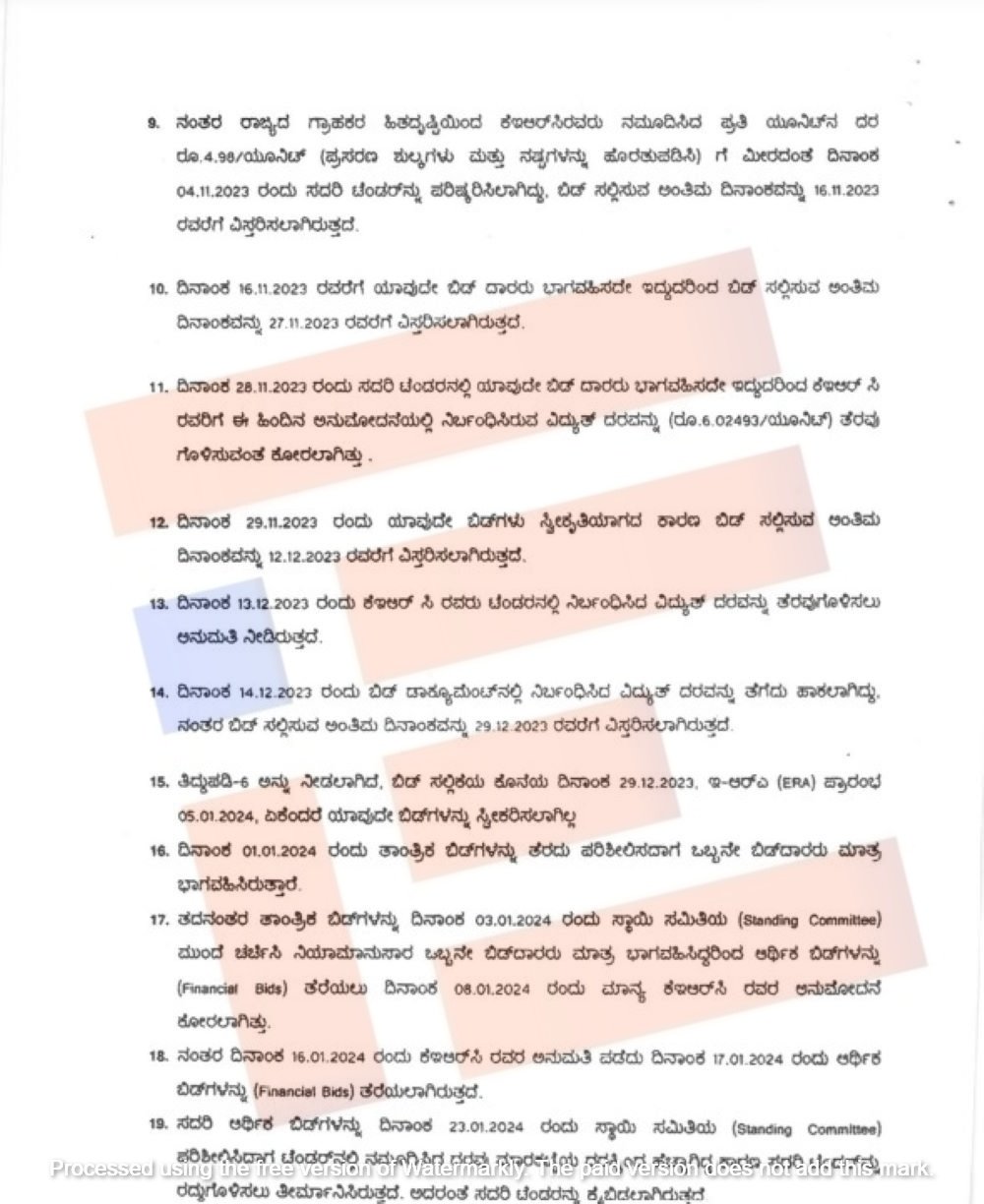 2023ರ ನವೆಂಬರ್ 29ರಂದು ಯಾವುದೇ ಬಿಡ್ಗಳು ಸ್ವೀಕೃತವಾಗಿರಲಿಲ್ಲ. ಹೀಗಾಗಿ ಅಂತಿಮ ದಿನಾಂಕವನ್ನು 2023ರ ಡಿಸೆಂಬರ್ 12ರವರೆಗೆ ಮತ್ತೆ ವಿಸ್ತರಿಸಲಾಗಿತ್ತು. ಮತ್ತು ಟೆಂಡರ್ನಲ್ಲಿ ನಿರ್ಬಂಧಿಸಿದ್ದ ವಿದ್ಯುತ್ ದರ ತೆರವುಗೊಳಿಸಲು ಅನುಮತಿ ನೀಡಿತ್ತು. ಅಲ್ಲದೇ 2023ರ ಡಿಸೆಂಬರ್ 1ರಂದು ಬಿಡ್ ಡಾಕ್ಯುಮೆಂಟ್ನಲ್ಲಿ ನಿರ್ಬಂಧಿಸಿದ್ದ ವಿದ್ಯುತ್ ದರವನ್ನು ತೆಗೆದು ಹಾಕಿತ್ತು. ನಂತರ ಬಿಡ ಸಲ್ಲಿಸುವ ಅಂತಿಮ ದಿನಾಂಕವನ್ನು 2023ರ ಡಿಸೆಂಬರ್ 29ರವರೆಗೆ ಮತ್ತೊಮ್ಮೆ ವಿಸ್ತರಿಸಿತ್ತು ಎಂಬುದು ಉತ್ತರದಿಂದ ಗೊತ್ತಾಗಿದೆ.