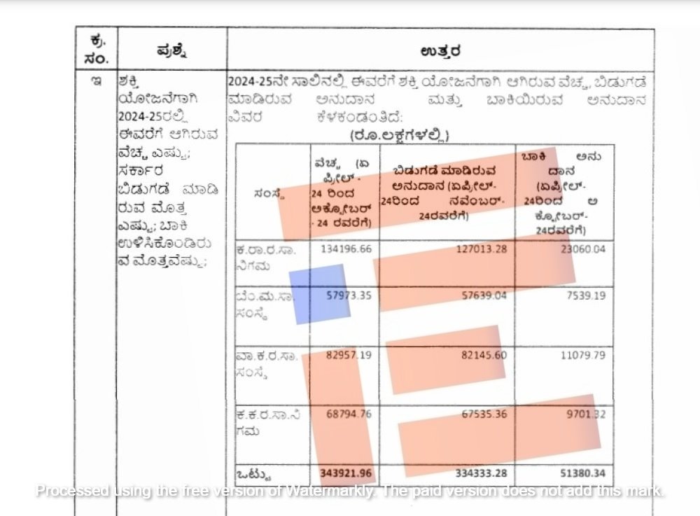 ಶಕ್ತಿ ಯೋಜನೆ ಜಾರಿಯಾದ ಜೂನ್ 2023ರಿಂದ 2024ರ ನವೆಂಬರ್ ವರೆಗೆ ಸರ್ಕಾರವು ನಾಲ್ಕು ನಿಗಮಗಳಿಗೆ ಒಟ್ಟಾರೆ 6, 543.06 ಕೋಟಿ ರು. ಪಾವತಿಸಿದೆ. ಇದರಲ್ಲಿ ಕೆಎಸ್ಆರ್ಟಿಸಿಗೆ 2,481.93 ಕೋಟಿ ರು., ಬಿಎಂಟಿಸಿಗೆ 1,126.05 ಕೋಟಿ ರು., ವಾಯುವ್ಯ ಕರ್ನಾಟಕ ಸಾರಿಗೆ ನಿಗಮಕ್ಕೆ 1,613.67 ಕೋಟಿ ರು., ಕಲ್ಯಾಣ ಕರ್ನಾಟಕ ಸಾರಿಗೆ ನಿಗಮಕ್ಕೆ 1,321.41 ಕೋಟಿ ರು. ಪಾವತಿಸಿರುವುದು ಉತ್ತರದಿಂದ ಗೊತ್ತಾಗಿದೆ.