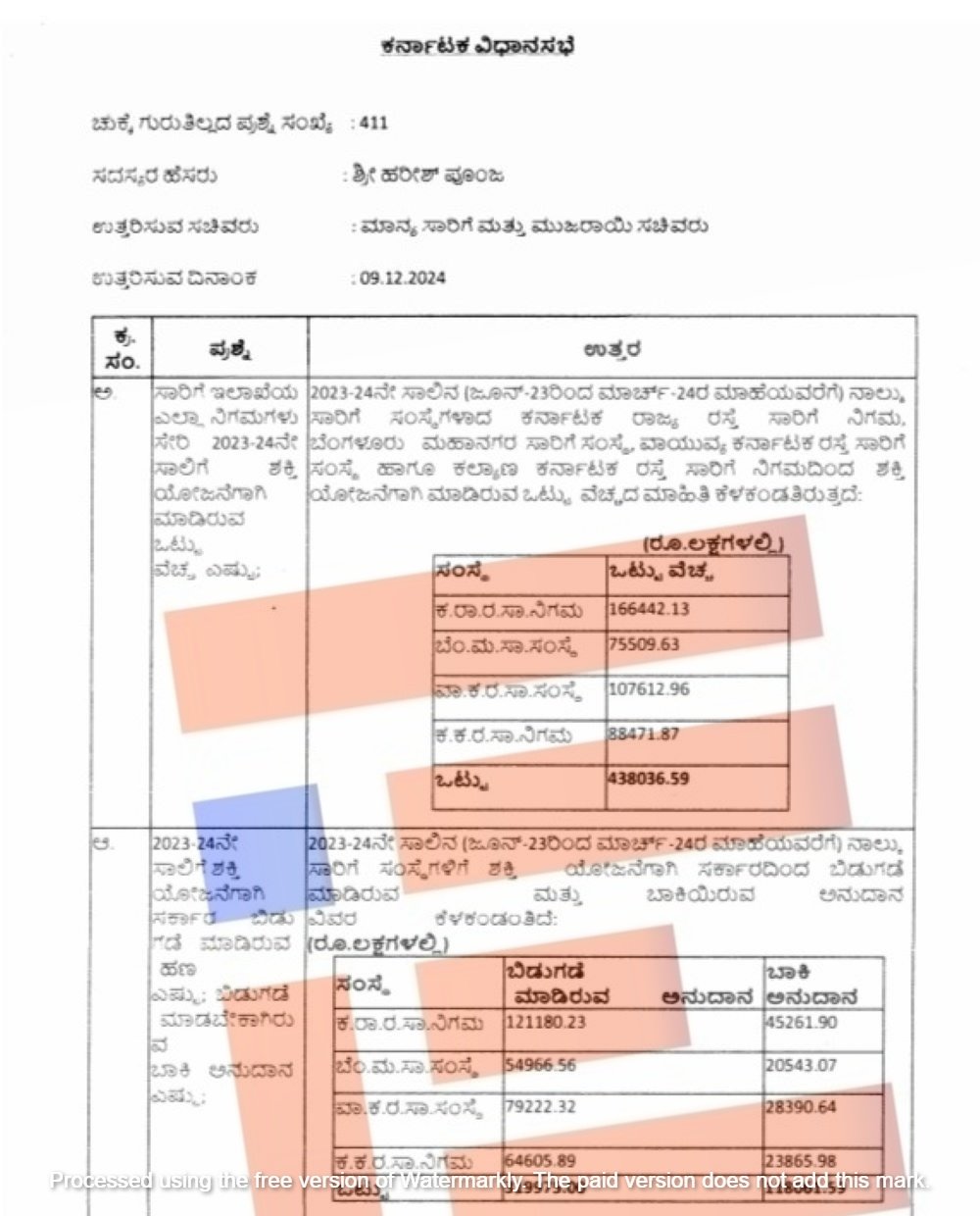 ‘2023-24ನೇ ಸಾಲಿನ ಆಯವ್ಯಯದಲ್ಲಿ ನಿಗದಿಪಡಿಸಿದ್ದ ಅನುದಾನವನ್ನು ಸಾರಿಗೆ ಸಂಸ್ಥೆಗಳಿಗೆ ಬಿಡುಗಡೆ ಮಾಡಲಾಗಿದೆ. 2024-25ನೇ ಸಾಲಿನಲ್ಲಿ ನಿಗದಿಪಡಿಸಿರುವ ಅನುದಾವನ್ನು ಹಂತ ಹಂತವಾಗಿ ಮಾಹೆವಾರು ಬಿಡುಗಡೆಗೊಳಿಸಲಾಗುತ್ತಿದೆ. ಆಯವ್ಯಯದಲ್ಲಿ ಅಗತ್ಯ ಅನುದಾನ ದೊರಕಿದ ನಂತರ ಬಾಕಿ ಅನುದಾನವನ್ನು ಸಹ ಪಾವತಿಸಲು ಕ್ರಮ ವಹಿಸಲಾಗುವುದು,’ ಎಂದು ಸಾರಿಗೆ ಸಚಿವ ರಾಮಲಿಂಗಾರೆಡ್ಡಿ ಅವರು ವಿವರವಾದ ಉತ್ತರ ಒದಗಿಸಿರುವುದು ತಿಳಿದು ಬಂದಿದೆ.
