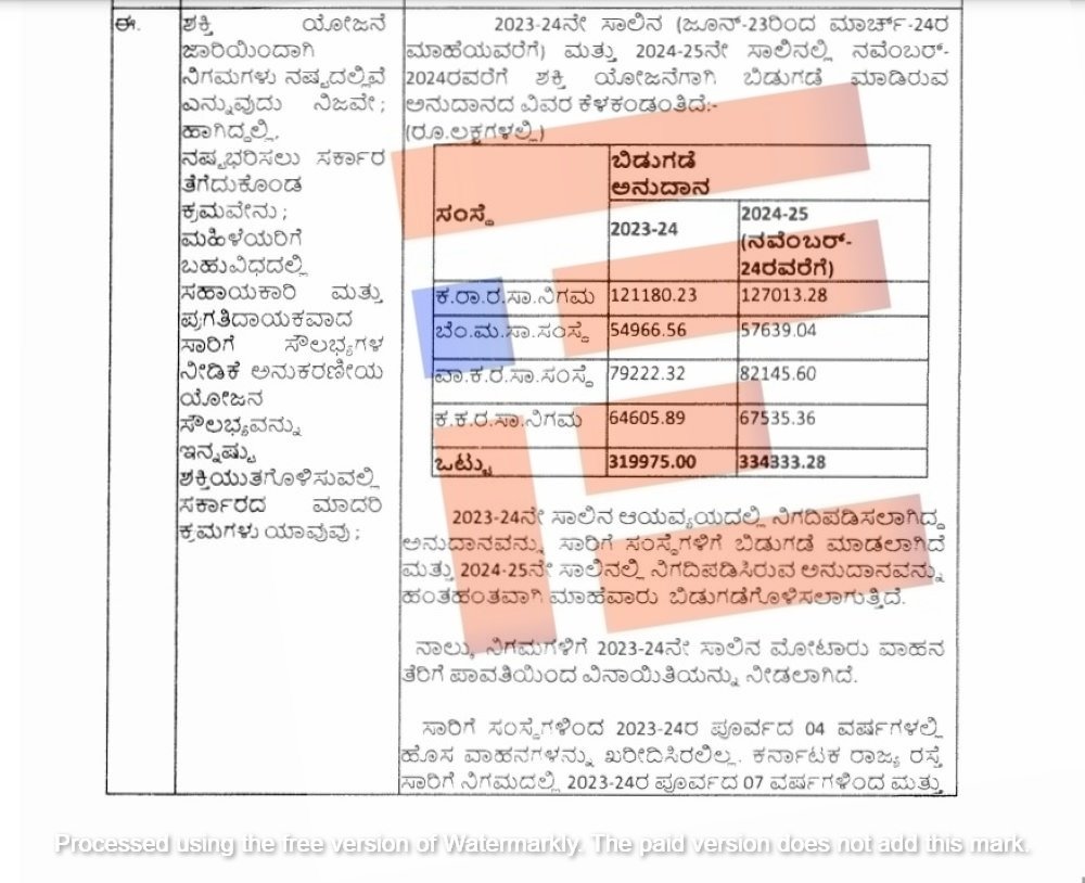 ಶಕ್ತಿ ಯೋಜನೆಯಡಿ ಜೂನ್ 2023ರಿಂದ ಫೆಬ್ರುವರಿ 2024ರವರೆಗೆ ಸಹಾಯಾನುದಾನ ಬಿಡುಗಡೆ ಮಾಡಿತ್ತಾದರೂ 1,373.77 ಕೋಟಿ ರು. ಕೊರತೆಯುಂಟಾಗಿತ್ತು. ಈ ಬಗ್ಗೆ ಕೆಎಸ್ಆರ್ಟಿಸಿ ವ್ಯವಸ್ಥಾಪಕ ನಿರ್ದೇಶಕರು ಗಮನಕ್ಕೆ ತಂದಿದ್ದರು. ಆದರೂ ಸಹ ನಿಗಮಗಳು ಇರಿಸಿದ್ದ ಬೇಡಿಕೆ ಪೈಕಿ 2024ರ ಮಾರ್ಚ್ 13ರಂದು ಕೇವಲ 399.75 ಕೋಟಿ ರು.ಗಳನ್ನು ಬಿಡುಗಡೆ ಮಾಡಿತ್ತು. ಅಲ್ಲದೇ ಈ ಯೋಜನೆಯಡಿ ಬಿಡುಗಡೆ ಮಾಡಲು ಇನ್ನೂ 974.02 ಕೋಟಿ ರು.ಗಳನ್ನು ಬಾಕಿ ಉಳಿಸಿಕೊಂಡಿತ್ತು.