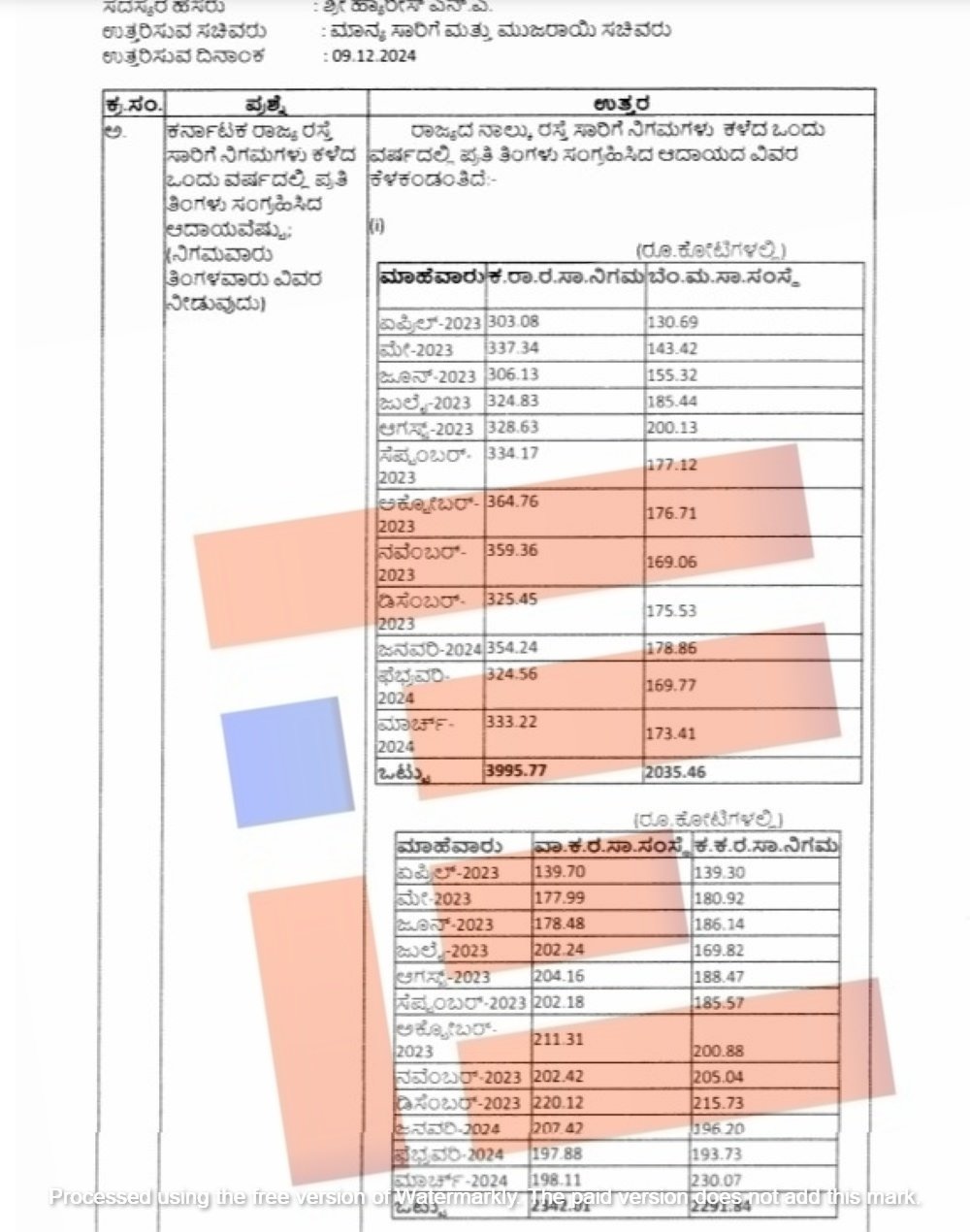 ವಾಯುವ್ಯ ಕರ್ನಾಟಕ ಸಾರಿಗೆ ನಿಗಮವು 2,342.01 ಕೋಟಿ ರು., ಕಲ್ಯಾಣ ಕರ್ನಾಟಕ ಸಾರಿಗೆ ನಿಗಮವು 2,291.84 ಕೋಟಿ ರು., ಆದಾಯ ಸಂಗ್ರಹಿಸಿದೆ. ಒಟ್ಟಾರೆ ಈ ನಾಲ್ಕು ಸಾರಿಗೆ ನಿಗಮಗಳು 10,665.08 ಕೋಟಿಯಷ್ಟು ಆದಾಯ ಸಂಗ್ರಹಿಸಿದೆ ಎಂದು ಲೆಕ್ಕವನ್ನು ಒದಗಿಸಿದ್ದಾರೆ.