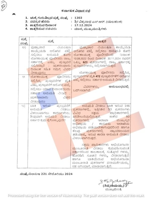 ಅದೇ ರೀತಿ 2022ರ ಅಗಸ್ಟ್ 10ರಿಂದ 2024ರ ನವೆಂಬರ್ 30ರವರೆಗೆ ಲೋಕಾಯುಕ್ತ ಪೊಲೀಸರು ಒಟ್ಟು 623 ಪ್ರಕರಣಗಳ ಕುರಿತಾದ ಪ್ರಸ್ತಾವನೆಗಳನ್ನು ರಾಜ್ಯ ಸರ್ಕಾರಕ್ಕೆ ಸಲ್ಲಿಸಿದ್ದಾರೆ. ಲೋಕಾಯುಕ್ತ ಪೊಲೀಸರು ಸಲ್ಲಿಸಿದ್ದ ಈ ಪ್ರಸ್ತಾವನೆಗಳ ಪೈಕಿ 472 ಪ್ರಸ್ತಾವನೆಗಳಿಗೆ ಆರೋಪ ಪಟ್ಟಿ ಸಲ್ಲಿಸಲು ಸರ್ಕಾರವು ಅನುಮತಿ ನೀಡಿದೆ ಎಂದು ಸಿದ್ದರಾಮಯ್ಯ ಅವರು ಉತ್ತರ ಒದಗಿಸಿದ್ದಾರೆ.