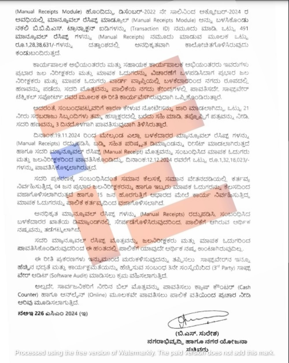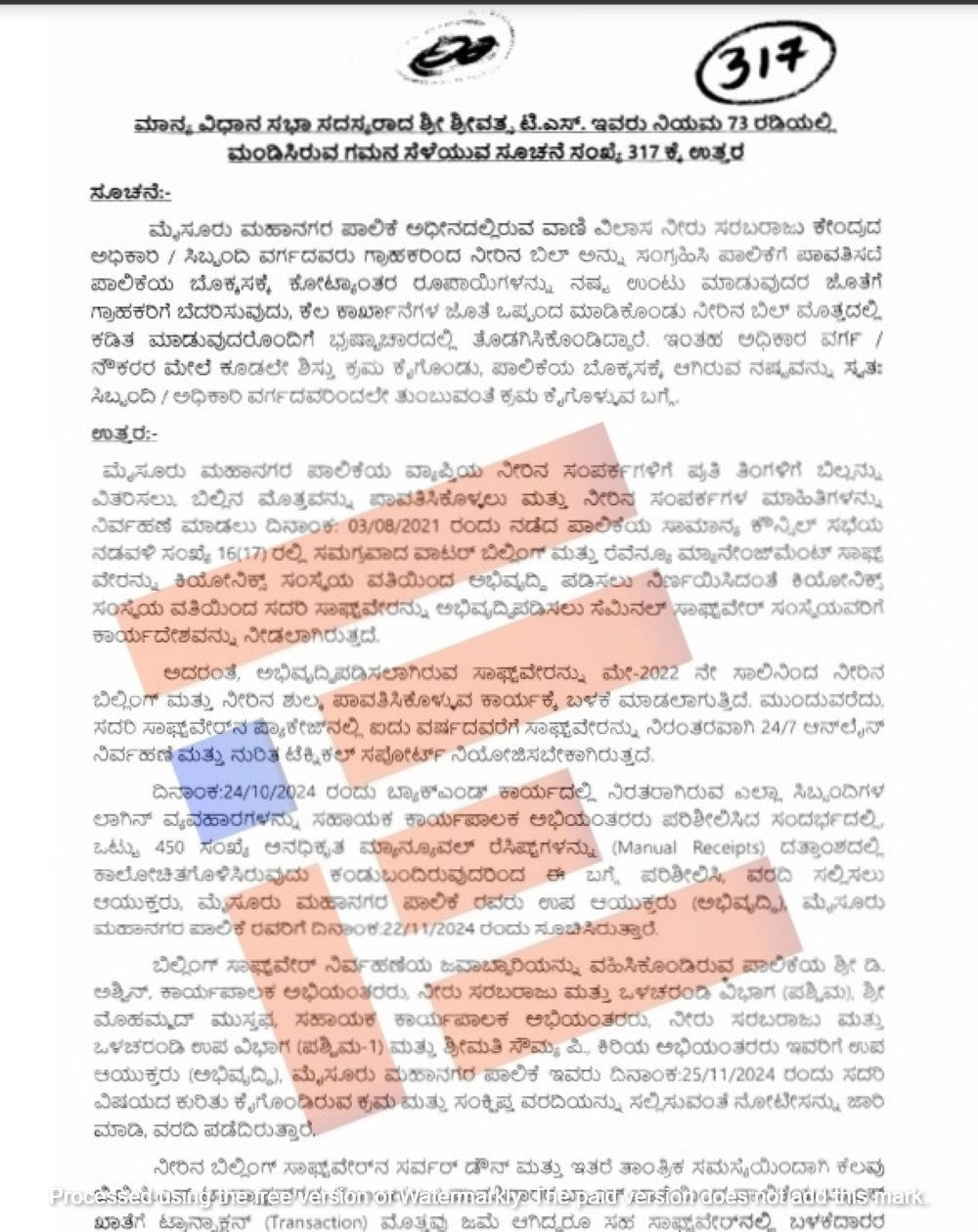 ಈ ಕುರಿತು ಸಾಫ್ಟ್‌ವೇರ್‍‌ನ ಬ್ಯಾಕ್‌ ಎಂಡ್‌ ಕಾರ್ಯದಲ್ಲಿ ನಿರತರಾಗಿದ್ದ ಎಲ್ಲಾ ಸಿಬ್ಬಂದಿಗಳ ಲಾಗಿನ್ ವ್ಯವಹಾರಗಳನ್ನು ಸಹಾಯಕ ಕಾರ್ಯಪಾಲಕ ಅಭಿಯಂತರರು ಪರಿಶೀಲಿಸಿದ್ದರು. ಈ ಸಂದರ್ಭದಲ್ಲಿ 450 ಸಂಖ್ಯೆಯಲ್ಲಿ ಅನಧಿಕೃತ ಮ್ಯಾನುಯಲ್‌ ರೆಸಿಪ್ಟ್‌ಗಳನ್ನು ದತ್ತಾಂಶಗಳಲ್ಲಿ ಕಾಲೋಚಿತಗೊಳಿಸಿದ್ದರು ಎಂಬ ಸಂಗತಿಯು ಪತ್ತೆಯಾಗಿತ್ತು. ಈ ಬಗ್ಗೆ ಪರಿಶೀಲಿಸಿ ವರದಿ ನೀಡಲು ಮೈಸೂರು ಮಹಾನಗರಪಾಲಿಕೆಯ ಆಯುಕ್ತರು ಉಪ ಆಯುಕ್ತರಿಗೆ ಸೂಚಿಸಿದ್ದರು ಎಂಬುದು ಸರ್ಕಾರವು ನೀಡಿರುವ ಉತ್ತರದಿಂದ ತಿಳಿದು ಬಂದಿದೆ.