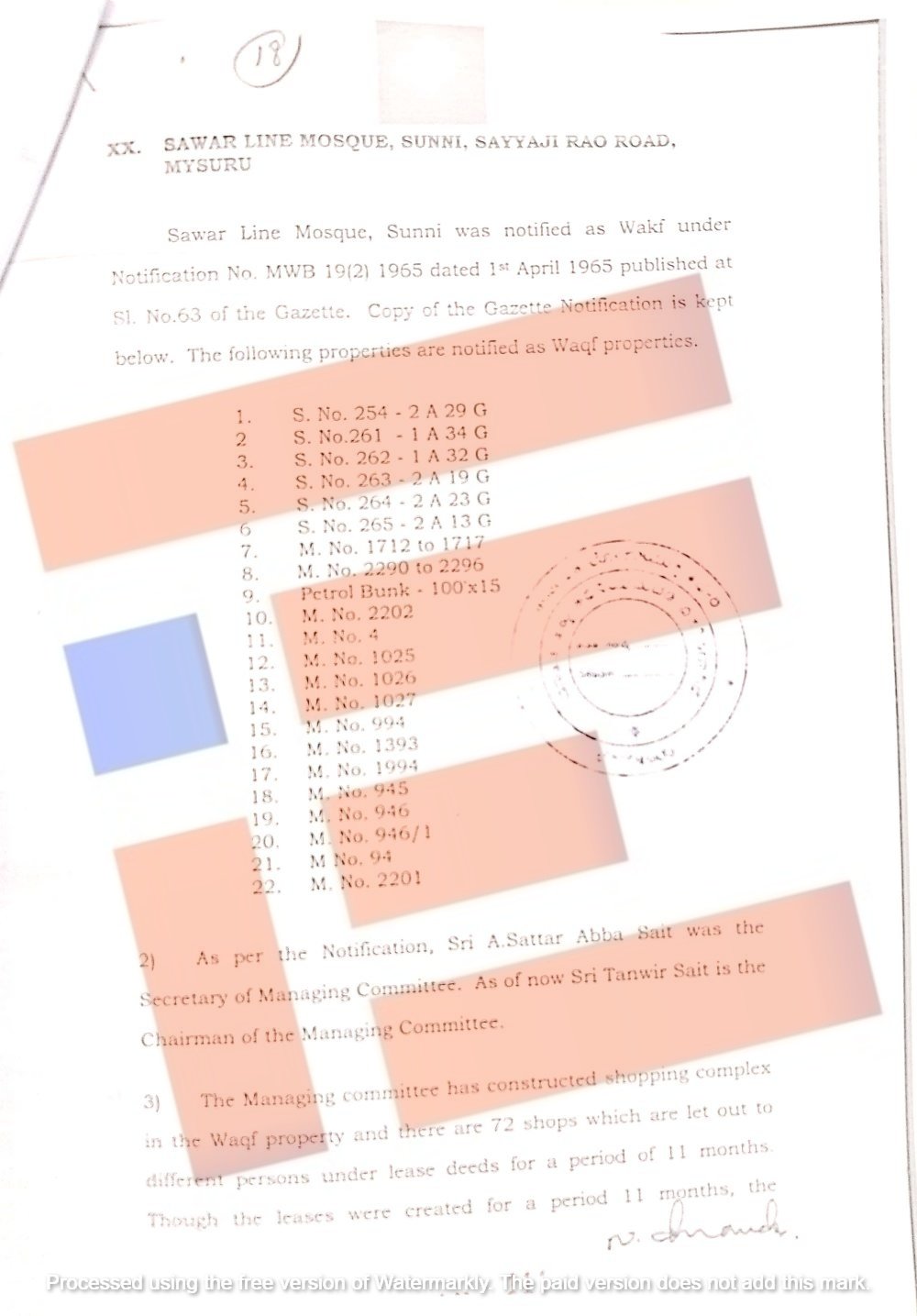 ಸವಾರ್ ಲೈನ್ ಮಸೀದಿ, ಸುನ್ನಿಗೆ ಸಂಬಂಧಿಸಿದಂತೆ ಒಟ್ಟು 22 ಆಸ್ತಿಗಳನ್ನು ವಕ್ಫ್ ಎಂದು 1965ರಲ್ಲೇ ಅಧಿಸೂಚಿಸಲಾಗಿತ್ತು. ಅಧಿಸೂಚನೆ ಪ್ರಕಾರ ಈ ಸಮಿತಿಗೆ ಎ ಸತ್ತಾರ್ ಅಬ್ಬಾ ಸೇಠ್ ಅವರು ವ್ಯವಸ್ಥಾಪನ ಸಮಿತಿಯ ಕಾರ್ಯದರ್ಶಿಯಾಗಿದ್ದರು. ಉಪ ಲೋಕಾಯುಕ್ತರು ವರದಿ ನೀಡುವ ಹೊತ್ತಿಗೆ ಸಚಿವರಾಗಿದ್ದ ತನ್ವೀರ್ ಸೇಠ್ ಅವರು (ಹಾಲಿ ಶಾಸಕರೂ ಹೌದು) ಈ ಸಮಿತಿಗೆ ಅಧ್ಯಕ್ಷರಾಗಿದ್ದರು. ಈ ಸಮಿತಿಯು ವಕ್ಫ್ ಆಸ್ತಿಯಲ್ಲಿ ವಾಣಿಜ್ಯ ಮಳಿಗೆಗಳನ್ನು ನಿರ್ಮಿಸಿತ್ತು.