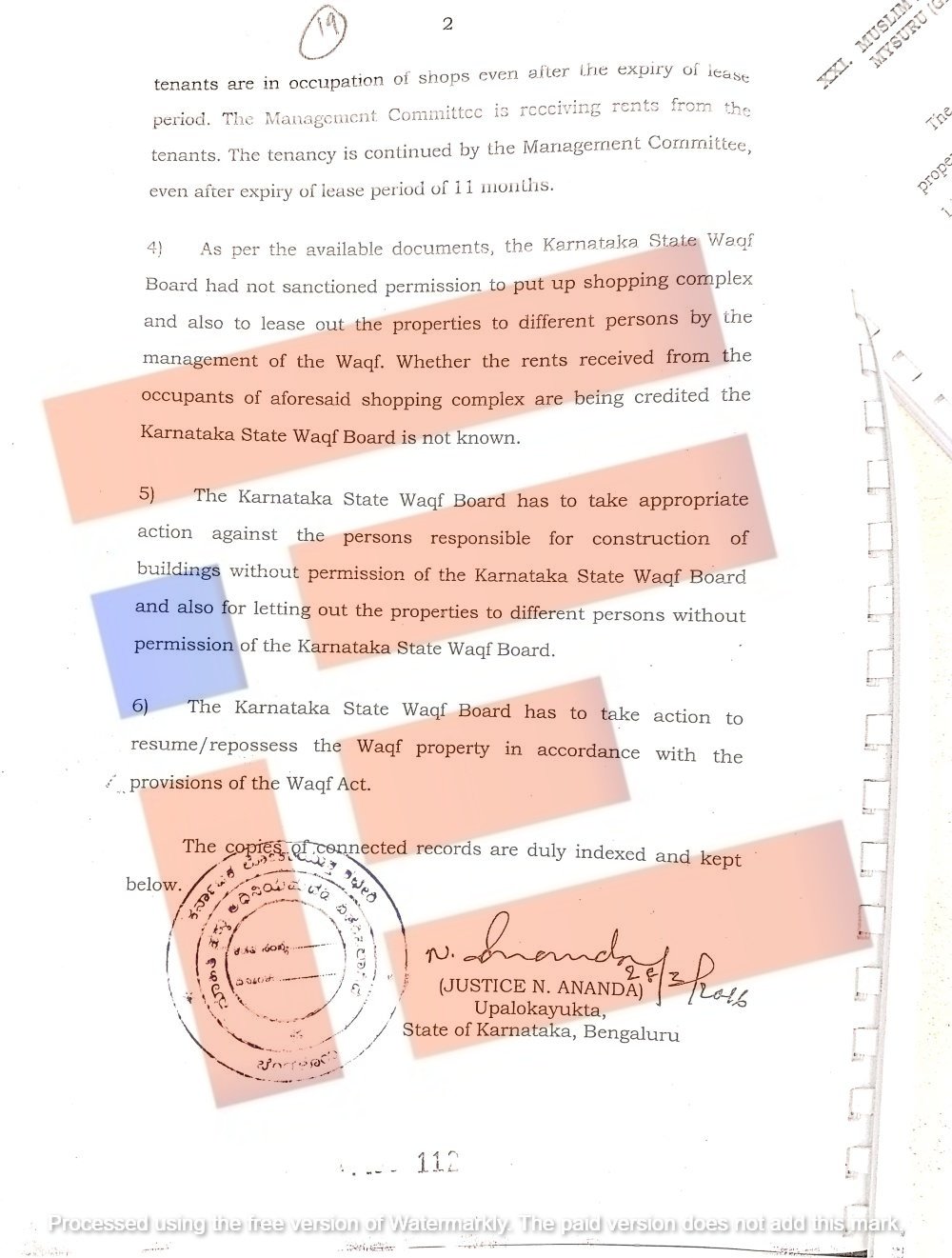 ವಕ್ಫ್ ಆಸ್ತಿ ದುರ್ಬಳಕೆ, ಅತಿಕ್ರಮಣ ಮತ್ತು ದುರುಪಯೋಗ ಸೇರಿದಂತೆ ಇನ್ನಿತರೆ ಆರೋಪಗಳಿಗೆ ಸಂಬಂಧಿಸಿದಂತೆ ಕರ್ನಾಟಕ ಸರ್ಕಾರದ ಸೂಚನೆಯಂತೆ ತನಿಖೆ ನಡೆಸಿದ್ದ ಉಪ ಲೋಕಾಯುಕ್ತ ಎನ್ ಆನಂದ್ ಅವರು, ವಕ್ಫ್ ಆಸ್ತಿಯ ದುರ್ಬಳಕೆಯ ವಿವಿಧ ಮುಖವಾಡಗಳನ್ನು ತಮ್ಮ ತನಿಖಾ ವರದಿಯಲ್ಲಿ ತೆರೆದಿಟ್ಟಿದ್ದಾರೆ.