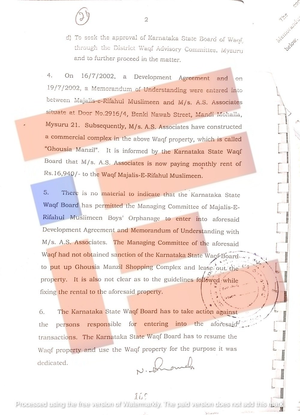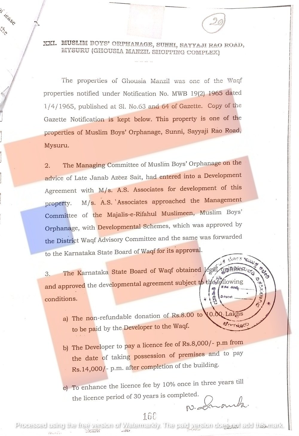 ಅಲ್ಲದೇ ಕರ್ನಾಟಕ ರಾಜ್ಯ ವಕ್ಫ್ ಮಂಡಳಿಯು ಕೆಲವು ಷರತ್ತುಗಳನ್ನು ವಿಧಿಸಿ ಅಭಿವೃದ್ಧಿ ಒಪ್ಪಂದವನ್ನು ಕಾನೂನುಬದ್ಧಗೊಳಿಸಿ ಅನುಮೋದಿಸಿತ್ತು. ಅಭಿವೃದ್ಧಿದಾರರು ವಕ್ಫ್ಗೆ ಪಾವತಿಸಬೇಕಾದ 8.00 ರಿಂದ 10.00 ಲಕ್ಷಗಳ ಮರು ಪಾವತಿಸಲಾಗದ ದೇಣಿಗೆ, ಅಭಿವೃದ್ಧಿದಾರರು ಆವರಣವನ್ನು ಸ್ವಾಧೀನಪಡಿಸಿಕೊಂಡ ದಿನಾಂಕದಿಂದ ತಿಂಗಳಿಗೆ 8,000 ರು.ನಂತೆ ಪರವಾನಗಿ ಶುಲ್ಕವನ್ನು ಪಾವತಿಸಬೇಕು.