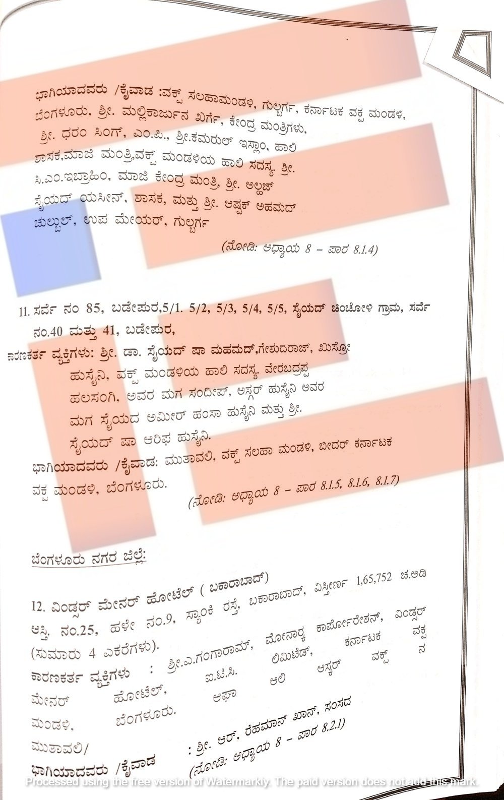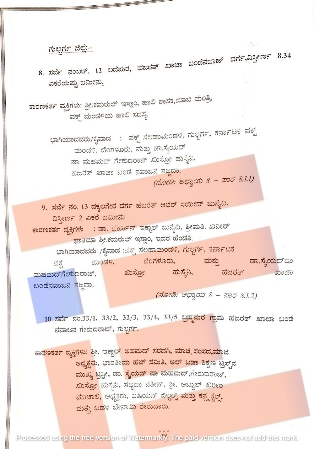 ಈ ಪೈಕಿ ಸಿದ್ದಪ್ಪ ಎಂಬುವರ ಕಾನೂನು ವಾರಸುದಾರರು ಎಂದು ಹೇಳಲಾಗಿದ್ದ ಕಾನೂನು ವಾರಸುದಾರರು 31 ಗುಂಟೆ ಅಳತೆಯ ಸರ್ವೆ ನಂಬರ್ 33/4 ರಲ್ಲಿನ ಆಸ್ತಿಯನ್ನು ಮಾಜಿ ಶಾಸಕರಾಗಿದ್ದ ಇಕ್ಬಾಲ್ ಅಹ್ಮದ್ ಸರಡಗಿ ಅವರಿಗೆ ಮಾರಾಟ ಮಾಡಿದ್ದರು. ಅಲ್ಲದೇ ಇದೇ ಸರ್ವೇ ನಂಬರ್ ನಲ್ಲಿನ 33 ಗುಂಟೆ ಜಮೀನನ್ನು ನಾಗಪ್ಪ ದಾದಪ್ಪಗೋಳ್ ಅವರ ಕಾನೂನು ವಾರಸುದಾರರು ಇಕ್ಬಾಲ್ ಅಹಮ್ಮದ್ ಸರಡಗಿ ಅವರಿಗೆ ನೋಂದಾಯಿತ ಮಾರಾಟ ಪತ್ರದ ಅಡಿಯಲ್ಲಿ ಮಾರಾಟ ಮಾಡಿದ್ದರು ಎಂದು ವರದಿಯಲ್ಲಿ ವಿವರಿಸಲಾಗಿದೆ.
