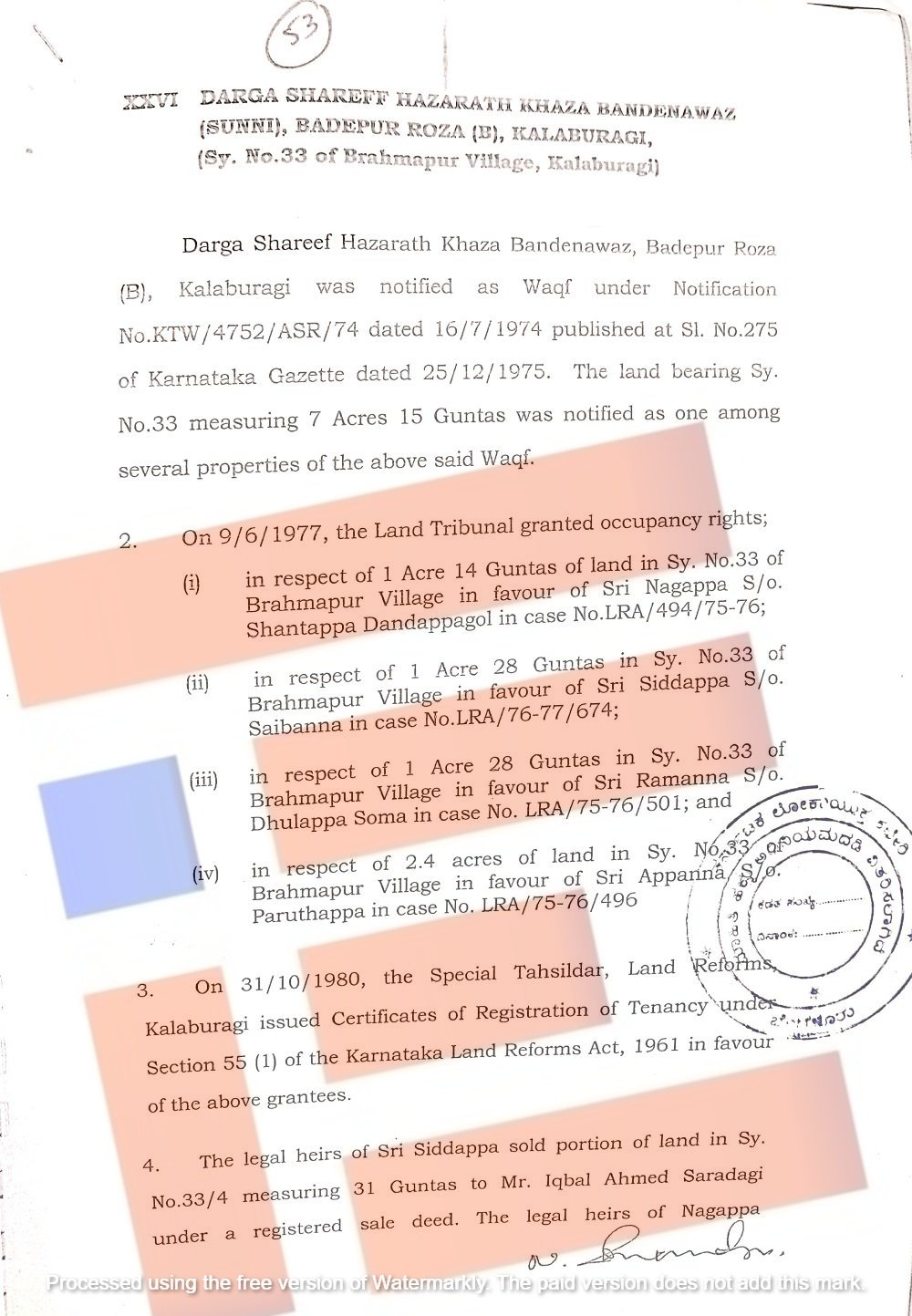 ಕಲ್ಬುರ್ಗಿಯ ಬ್ರಹ್ಮಾಪುರದ ಸರ್ವೆ ನಂಬರ್ 33ರಲ್ಲಿನ ವಕ್ಫ್ ಜಮೀನಿಗೆ ಸಂಬಂಧಿಸಿದಂತೆ ಭೂ ಸುಧಾರಣೆಯ ವಿಶೇಷ ತಹಶೀಲ್ದಾರ್ ಅವರು ಅನುಭೋಗದಾರರ ಪರವಾಗಿ ಕರ್ನಾಟಕ ಭೂಸುಧಾರಣಾ ಕಾಯ್ದೆ 1961 ರ ಕಲಂ 55 (1) ಅಡಿಯಲ್ಲಿ ಹಿಡುವಳಿದಾರರ ನೋಂದಣಿ ಪ್ರಮಾಣಪತ್ರಗಳನ್ನು ನೀಡಿದ್ದರು.