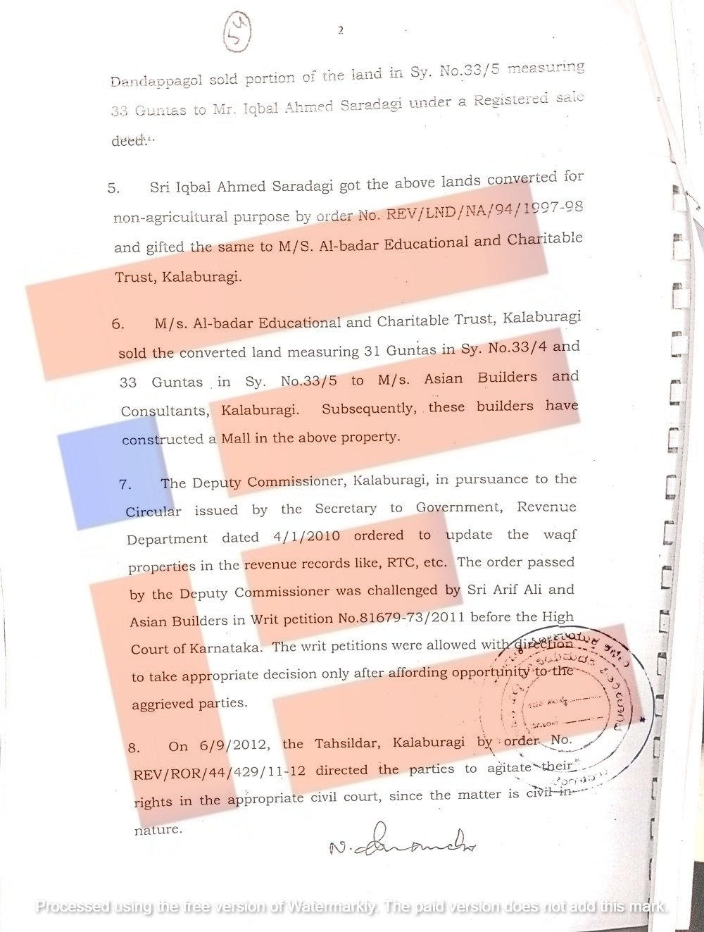ಇದಾದ ನಂತರ ಕಲ್ಬುರ್ಗಿಯ ಅಂದಿನ ಜಿಲ್ಲಾಧಿಕಾರಿ, ಕಂದಾಯ ಇಲಾಖೆಯ ಸರ್ಕಾರದ ಕಾರ್ಯದರ್ಶಿಗಳು 2010ರ ಜನವರಿ 4ರಂದೇ ಸುತ್ತೋಲೆ ಹೊರಡಿಸಿದ್ದರು. ಇದರ ಪ್ರಕಾರ ವಕ್ಫ್ ಆಸ್ತಿಗಳನ್ನು ಕಂದಾಯ ದಾಖಲೆಗಳಾದ ಆರ್ಟಿಸಿ ಸೇರಿದಂತೆ ಇನ್ನಿತರೆ ದಾಖಲೆಗಳಲ್ಲಿ ನವೀಕರಿಸಬೇಕಿತ್ತು. ಈ ಆದೇಶವನ್ನು ಆರಿಫ್ ಆಲಿ ಮತ್ತು ಏಷ್ಯನ್ ಬಿಲ್ಡರ್ಸ್ ಸಮೂಹವು ಕರ್ನಾಟಕ ಹೈಕೋರ್ಟ್ನಲ್ಲಿ ರಿಟ್ ಅರ್ಜಿ ಮೂಲಕ ಪ್ರಶ್ನಿಸಿತ್ತು.