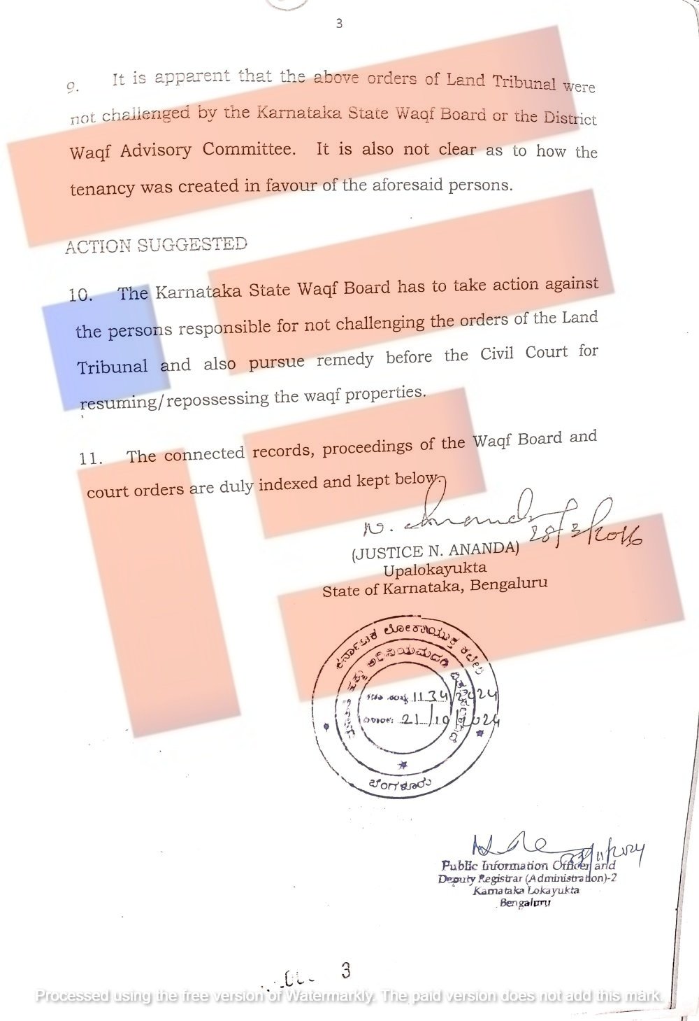 ‘ಭೂ ನ್ಯಾಯಮಂಡಳಿಯ ಈ ಮೇಲಿನ ಆದೇಶಗಳನ್ನು ಕರ್ನಾಟಕ ರಾಜ್ಯ ವಕ್ಫ್ ಮಂಡಳಿ ಅಥವಾ ಜಿಲ್ಲಾ ವಕ್ಫ್ ಸಲಹಾ ಸಮಿತಿಯು ಪ್ರಶ್ನಿಸಿಲ್ಲ ಎಂಬುದು ಸ್ಪಷ್ಟವಾಗಿದೆ. ಮೇಲಿನ ವ್ಯಕ್ತಿಗಳ ಪರವಾಗಿ ಹಿಡುವಳಿ ಹೇಗೆ ರಚಿಸಲಾಗಿದೆ ಎಂಬುದು ಸ್ಪಷ್ಟವಾಗಿಲ್ಲ,’ ಎಂದು ಉಪ ಲೋಕಾಯುಕ್ತರು ತಮ್ಮ ವರದಿಯಲ್ಲಿ ಅವಲೋಕಿಸಿರುವುದು ತಿಳಿದು ಬಂದಿದೆ.