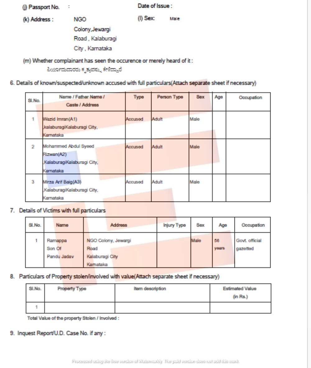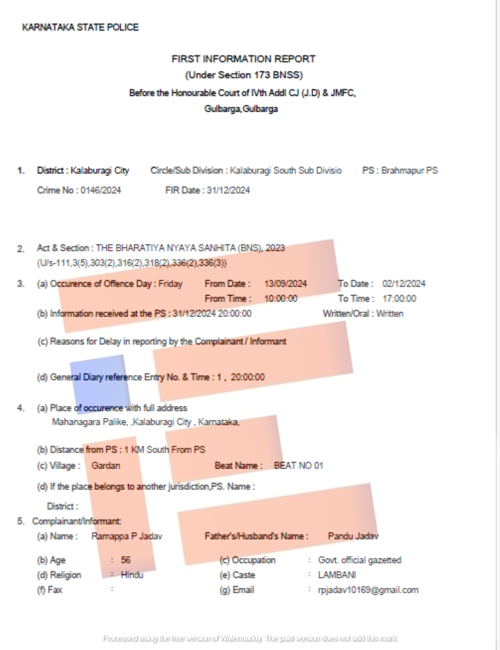 ಈ ದೂರನ್ನಾಧರಿಸಿ ಕಲ್ಬುರ್ಗಿ ಬ್ರಹ್ಮಪುರ ಪೊಲೀಸ್‌ ಠಾಣೆಯಲ್ಲಿ   2024ರ ಡಿಸೆಂಬರ್‌ 31ರಂದು ಮೂವರು ಆರೋಪಿಗಳ ವಿರುದ್ಧ ಎಫ್‌ಐಆರ್‌ ದಾಖಲಿಸಲಾಗಿದೆ.