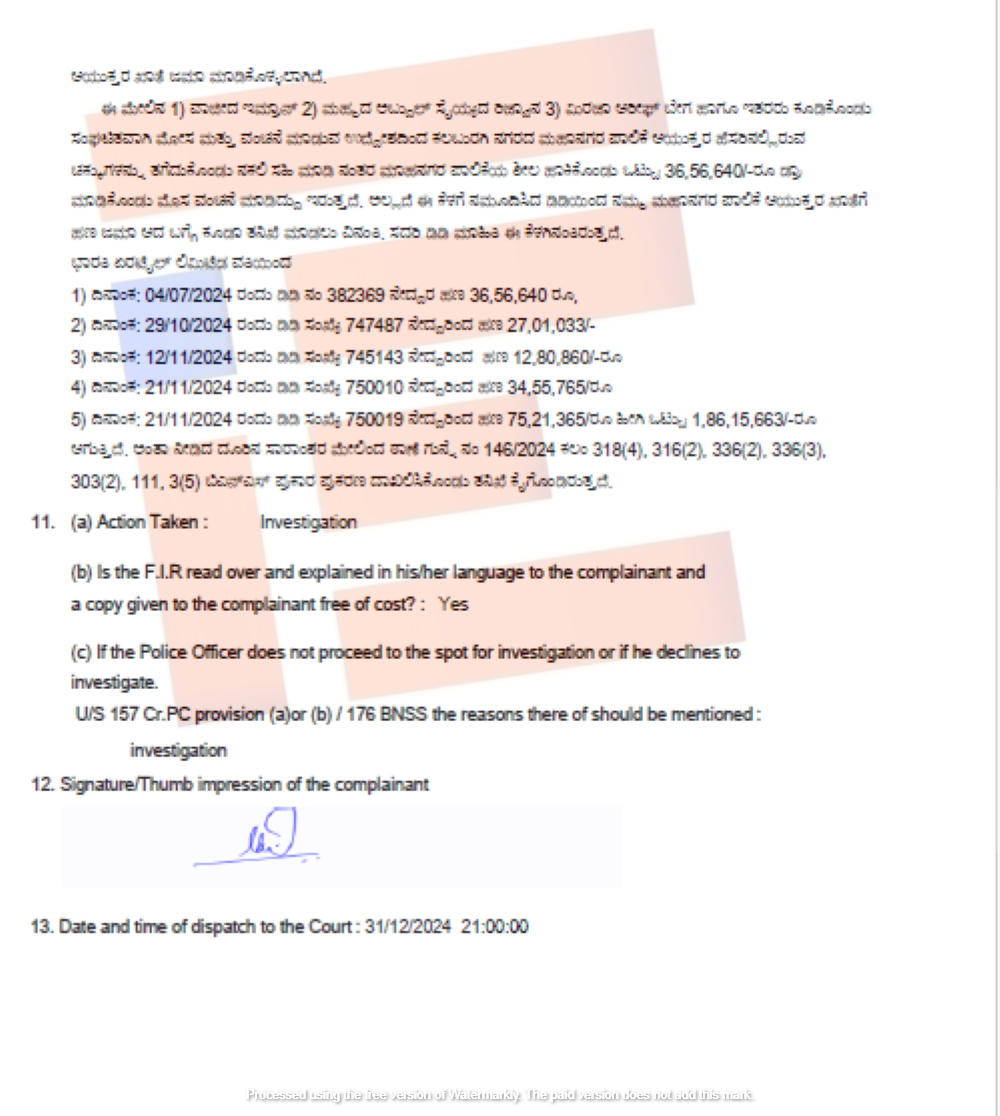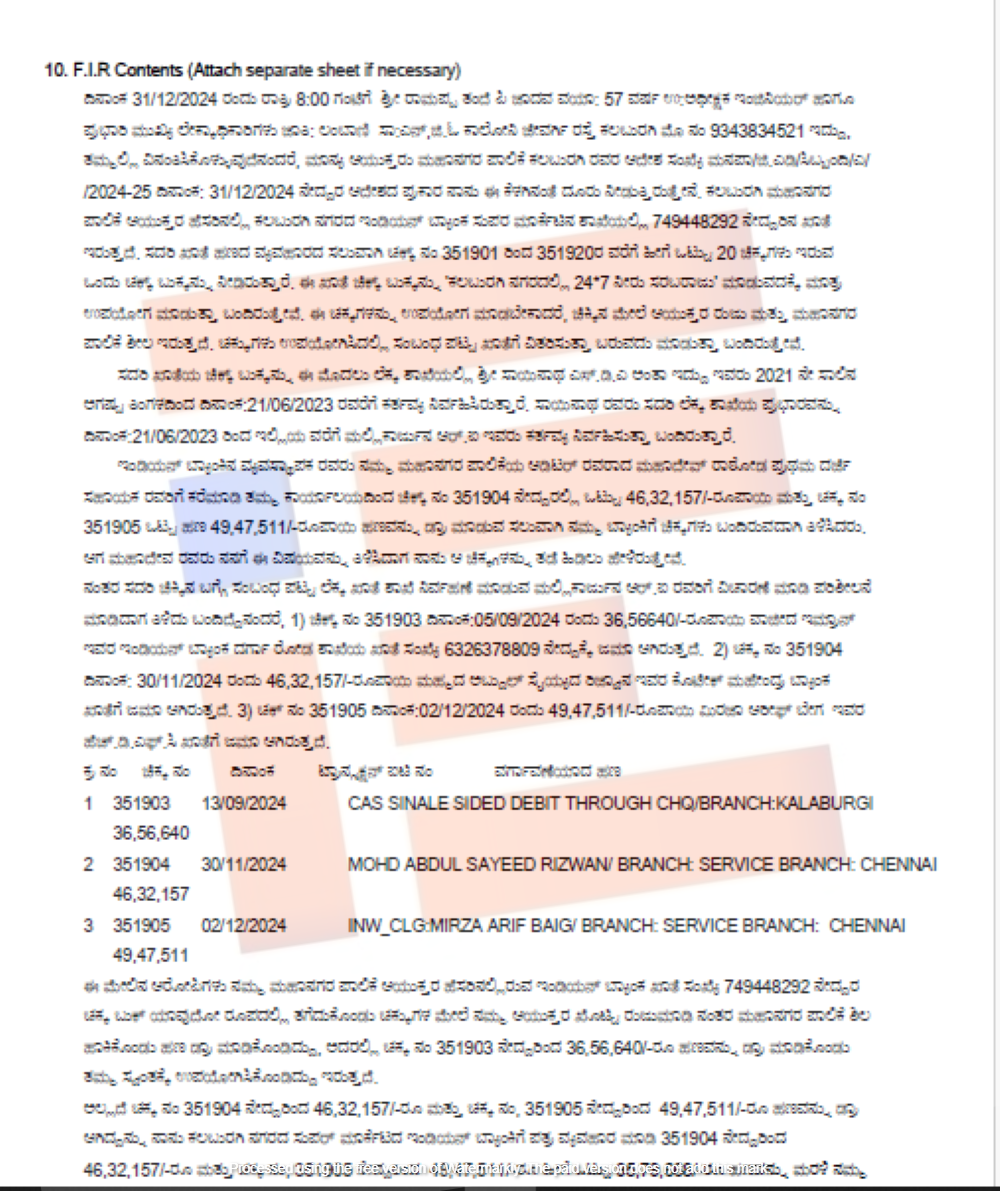 ಈ ಪೈಕಿ ಒಂದು ಚೆಕ್‌ (351903) ಕಲ್ಬುರ್ಗಿ ಶಾಖೆಯಲ್ಲಿ ಸಲ್ಲಿಕೆಯಾಗಿದ್ದರೇ ಇನ್ನೆರಡು ಚೆಕ್‌ಗಳು (351904, 351905) ಚೆನ್ನೈನಲ್ಲಿರುವ ಶಾಖೆಯಲ್ಲಿ ಸಲ್ಲಿಕೆಯಾಗಿತ್ತು. ಈ ಎಲ್ಲಾ ವಹಿವಾಟುಗಳು 2024ರ ಸೆ.13, ನವೆಂಬರ್‌ 30, ಡಿಸೆಂಬರ್‌ 2ರಂದು ನಡೆದಿತ್ತು ಎಂಬುದು ಎಫ್‌ಐಆರ್‌ನಿಂದ ತಿಳಿದು ಬಂದಿದೆ.