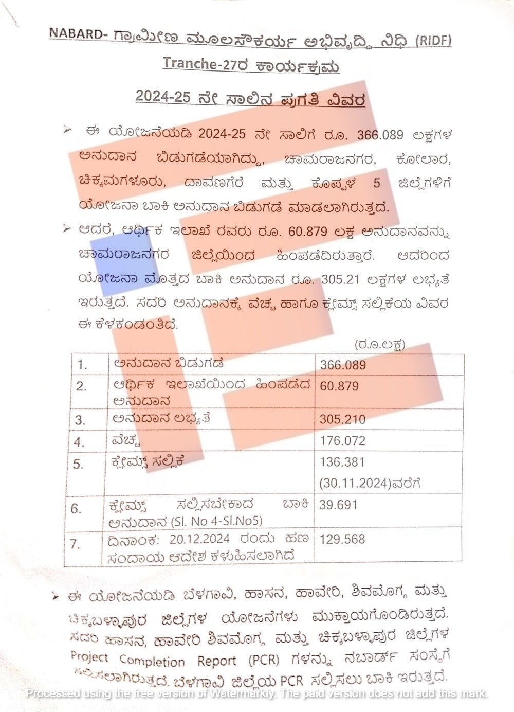 ನಬಾರ್ಡ್‌ ನೀಡಿದ್ದ ಒಟ್ಟು ಅನುದಾನದ ಪೈಕಿ 176.07 ಲಕ್ಷ ರು. ಖರ್ಚಾಗಿದೆ. ಈ ಸಂಬಂಧ 2024ರ ನವೆಂಬರ್‍‌ 30ರ ಅಂತ್ಯಕ್ಕೆ 136.38 ಲಕ್ಷ ರು ಗಳು ಕ್ಲೈಮ್‌ ಸಲ್ಲಿಕೆಯಾಗಿವೆ. ಕ್ಲೈಮ್ಸ್‌ ಸಲ್ಲಿಸಬೇಕಾದ ಅನುದಾನದ ಬಾಕಿ 39.69 ಲಕ್ಷ ರು. ಬಾಕಿ ಇರುವುದು ತಿಳಿದು ಬಂದಿದೆ.