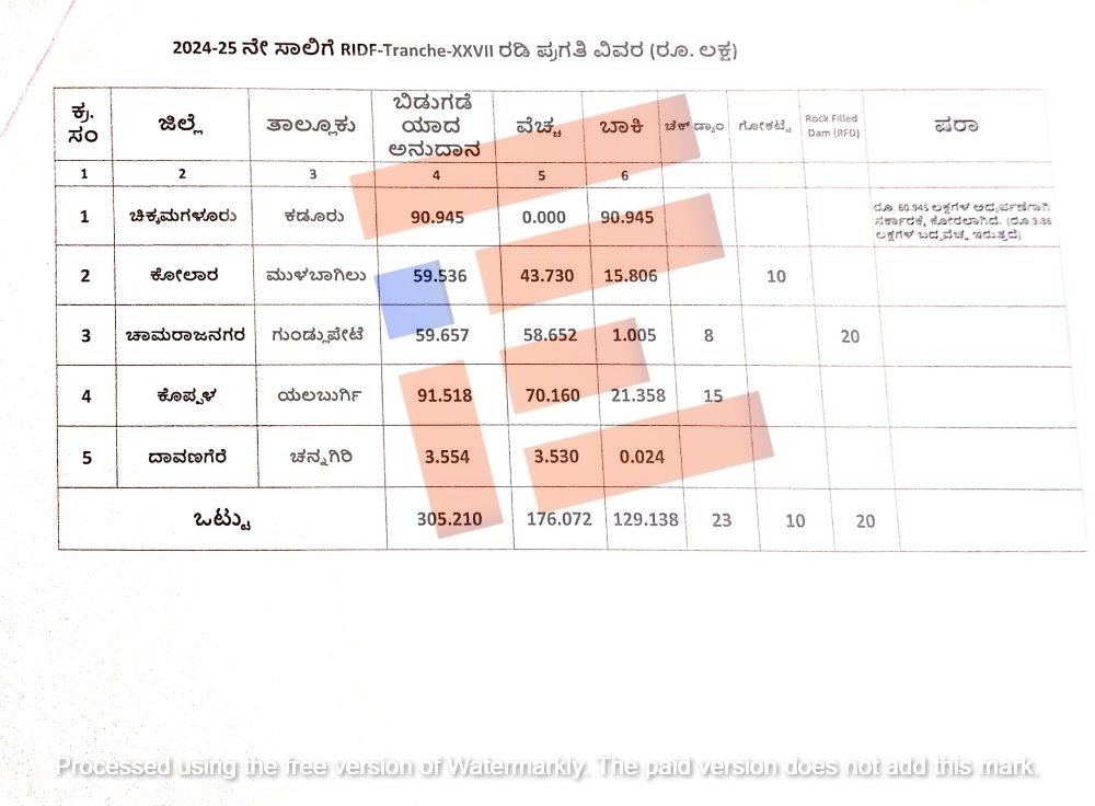 ಆರ್‍‌ಐಡಿಎಫ್‌ ಅನುದಾನದ ಅಡಿಯಲ್ಲಿ 2024-25ನೇ ಸಾಲಿಗೆ ನಬಾರ್ಡ್‌ ಒಟ್ಟಾರೆ 366.089 ಲಕ್ಷ ರು.ಗಳ ಅನುದಾನವನ್ನು ಬಿಡುಗಡೆ ಮಾಡಿತ್ತು. ಚಾಮರಾಜನಗರ, ಕೋಲಾರ, ಚಿಕ್ಕಮಗಳೂರು, ದಾವಣಗೆರೆ ಮತ್ತು ಕೊಪ್ಪಳ ಸೇರಿ 5 ಜಿಲ್ಲೆಗಳಿಗೆ ಯೋಜನಾ ಬಾಕಿ ಅನುದಾನ ಬಿಡುಗಡೆ ಮಾಡಿತ್ತು.