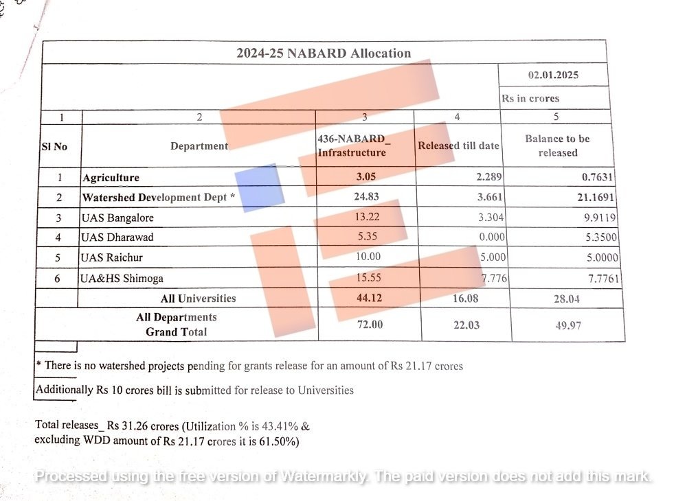 ಅದೇ ರೀತಿ ಕೃಷಿ ಇಲಾಖೆಗೆ 3.05 ಕೋಟಿ ರು. ಹಂಚಿಕೆಯಾಗಿತ್ತು. 2025ರ ಜನವರಿ 2ರ ಅಂತ್ಯಕ್ಕೆ 2.2 ಕೋಟಿ ಬಿಡುಗಡೆಯಾಗಿದೆ. ಅದೇ ರೀತಿ ಜಲಾನಯನ ಅಭಿವೃದ್ಧಿ ಇಲಾಖೆಗೆ 24.83 ಕೋಟಿ ರು. ಅನುದಾನದ ಪೈಕಿ 2025ರ ಜನವರಿ 2ರ ಅಂತ್ಯಕ್ಕೆ ಕೇವಲ 3.66 ಕೋಟಿ ರು ಮಾತ್ರ ಬಿಡುಗಡೆಯಾಗಿದೆ. ಬಿಡುಗಡೆಗೆ ಇನ್ನೂ 21.16 ಕೋಟಿ ರು ಬಾಕಿ ಇರುವುದು ತಿಳಿದು ಬಂದಿದೆ.