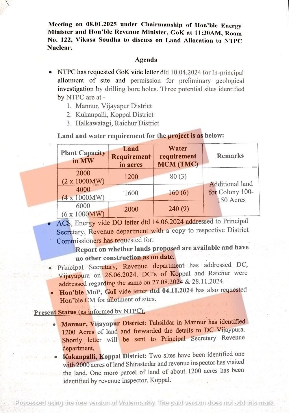 ಎನ್ಟಿಪಿಸಿ ಕೋರಿಕೆಯಂತೆ 4,800 ಎಕರೆ ವಿಸ್ತೀರ್ಣದ ಜಮೀನುಗಳನ್ನು ಜಿಲ್ಲಾಧಿಕಾರಿಗಳು ಗುರುತಿಸಬೇಕಿತ್ತು. ಅದರಂತೆ ವಿಜಯಪುರದ ಮಣ್ಣೂರು, ಕೊಪ್ಪಳದ ಕುಕನಪಲ್ಲಿ ಮತ್ತು ರಾಯಚೂರು ಜಿಲ್ಲೆಯ ಹಲಕಾವಟಗಿ ಗ್ರಾಮದಲ್ಲಿ ಜಮೀನುಗಳನ್ನು ಜಿಲ್ಲಾಧಿಕಾರಿಗಳು ಗುರುತಿಸಿದ್ದಾರೆ. ಮಣ್ಣೂರಿನಲ್ಲಿ 1,200 ಎಕರೆಯನ್ನು ತಹಶೀಲ್ದಾರ್ ಗುರುತಿಸಿದ್ದಾರೆ.