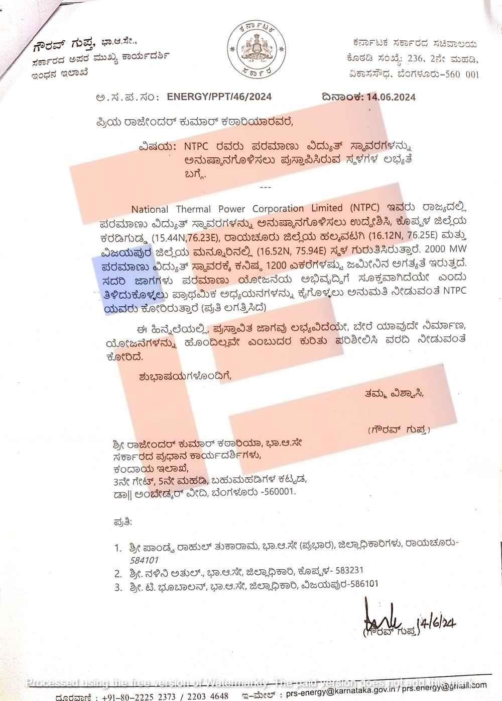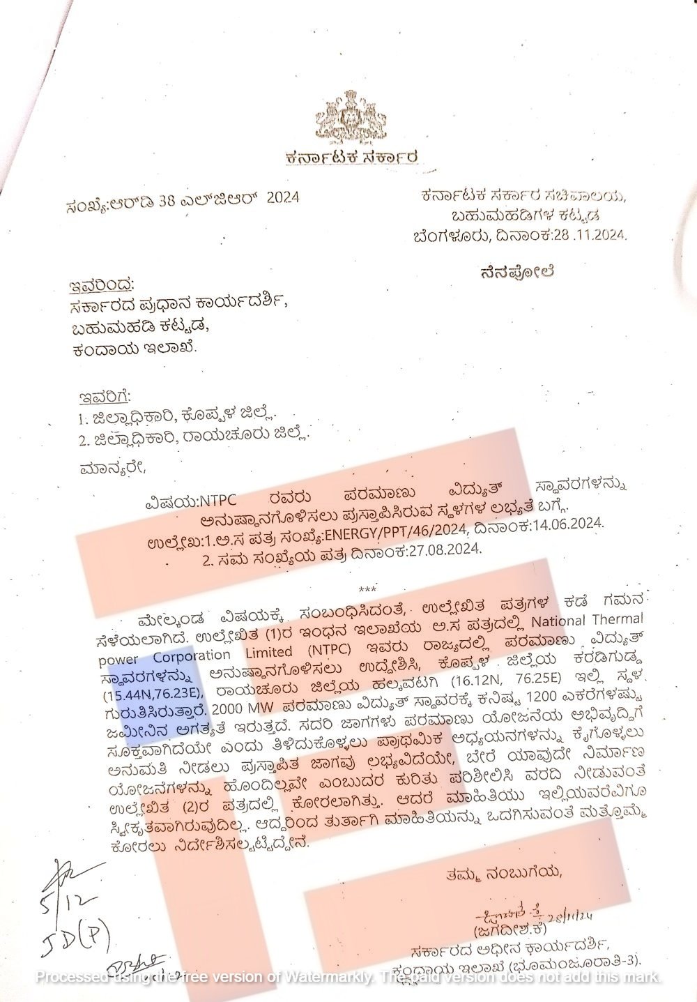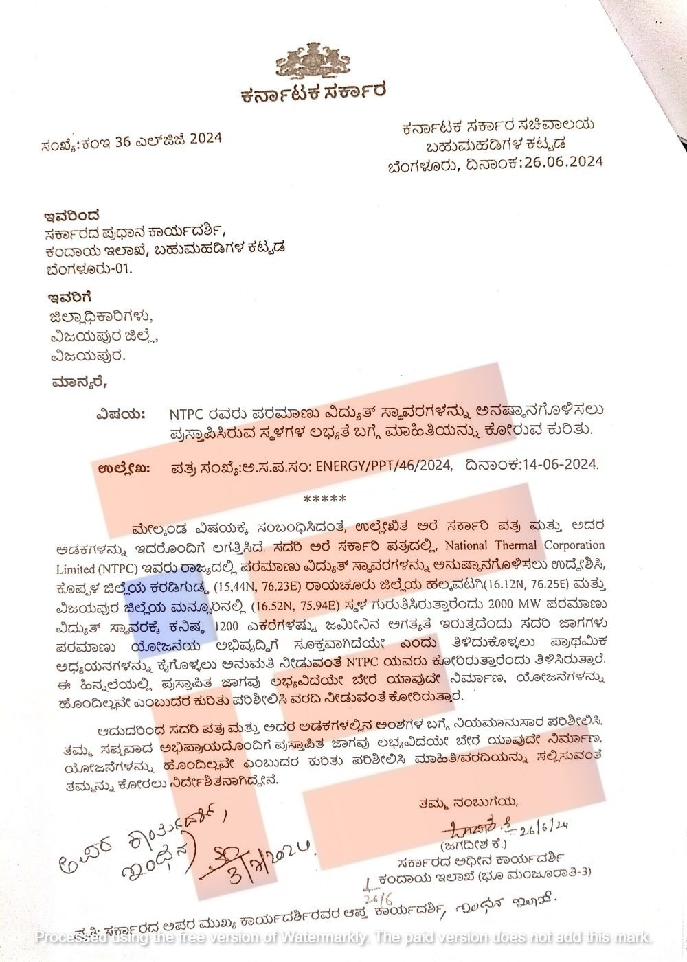 ಬೆಂಗಳೂರು; ಗ್ರಾಮಸ್ಥರ ತೀವ್ರ ವಿರೋಧದ ನಡುವೆಯೂ ವಿಜಯಪುರ, ಕೊಪ್ಪಳ ಮತ್ತು ರಾಯಚೂರು ಜಿಲ್ಲಾಧಿಕಾರಿಗಳು, ಪರಮಾಣು ವಿದ್ಯುತ್ ಸ್ಥಾವರಕ್ಕೆ ಅಂದಾಜು 4,800 ಎಕರೆಗೂ ಹೆಚ್ಚು ವಿಸ್ತೀರ್ಣದ ಜಮೀನುಗಳನ್ನು ಗುರುತಿಸಿದ್ದಾರೆ.