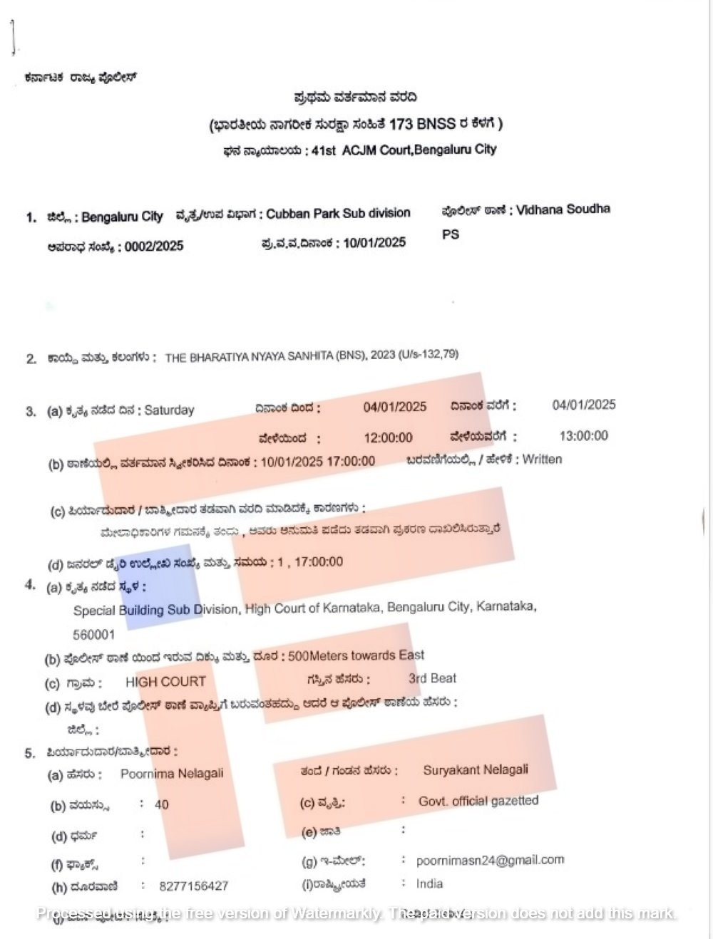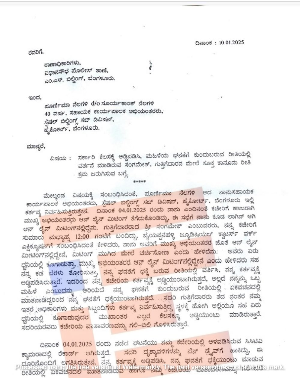 ಈ ಕುರಿತು ಇಬ್ಬರು ಮಹಿಳಾ ಇಂಜಿನಿಯರ್ಗಳಿಬ್ಬರು ಸರ್ಕಾರದ ಮುಖ್ಯ ಕಾರ್ಯದರ್ಶಿ ಡಾ ಶಾಲಿನಿ ರಜನೀಶ್ ಮತ್ತು ವಿಧಾನಸೌಧ ಪೊಲೀಸ್ ಠಾಣೆಗೆ ಲಿಖಿತ ದೂರು ಸಲ್ಲಿಸಿದ್ದಾರೆ. ಈ ದೂರನ್ನಾಧರಿಸಿ ಆಪಾದಿತ ಗುತ್ತಿಗೆದಾರೊಬ್ಬರ ವಿರುದ್ಧ ವಿಧಾನಸೌಧ ಪೊಲೀಸ್ ಠಾಣೆಯಲ್ಲಿ ಎಫ್ಐಆರ್ ದಾಖಲಿಸಲಾಗಿದೆ.