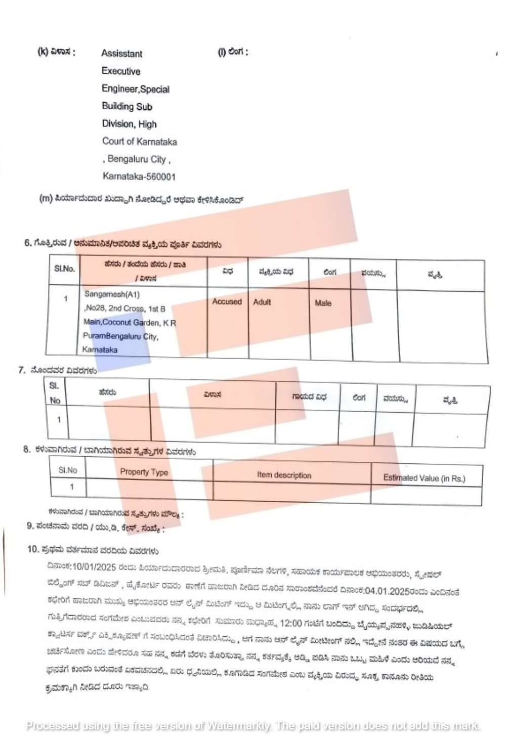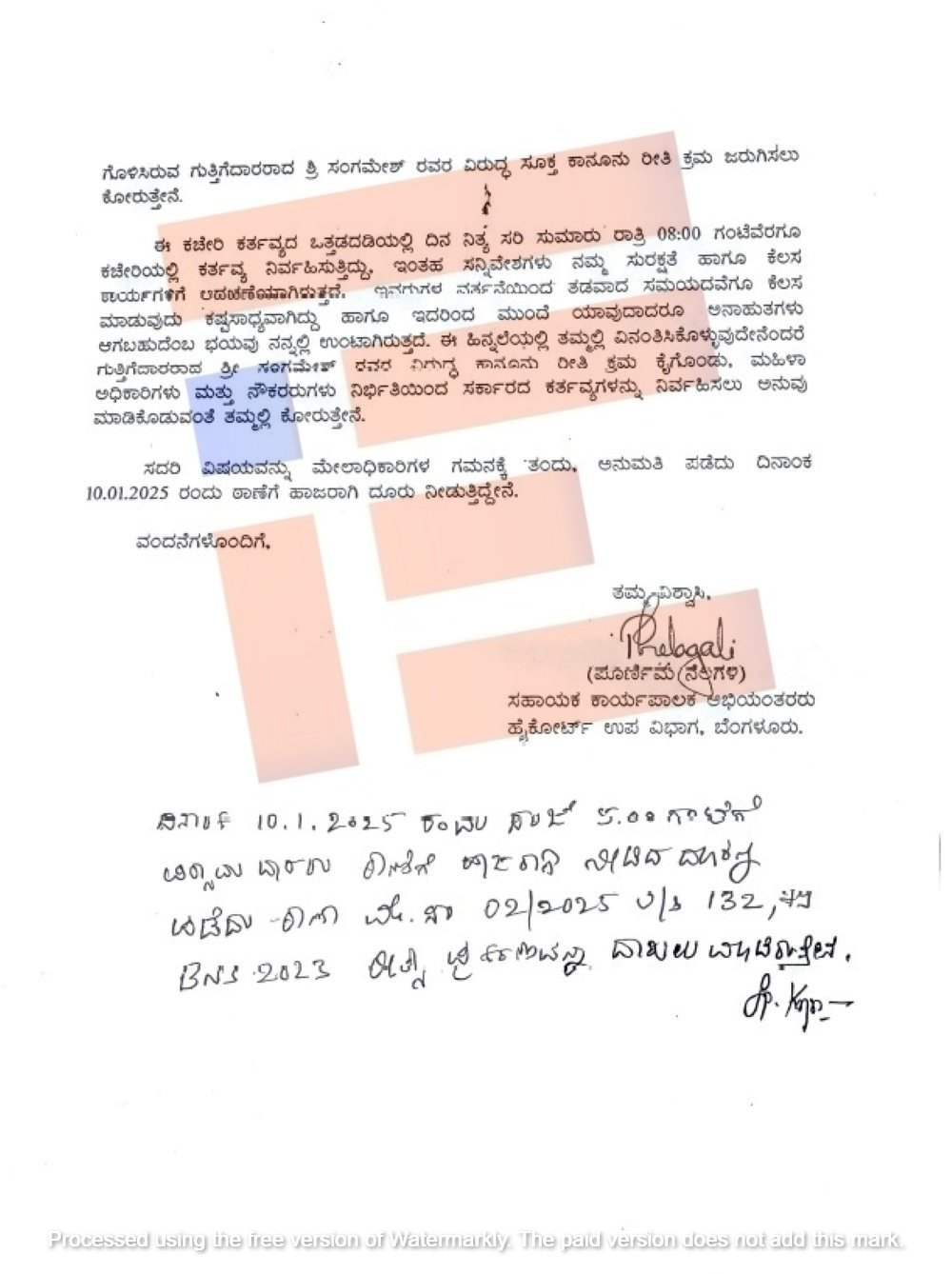 ಅದೇ ರೀತಿ ಇದೇ ಸಂಗಮೇಶ್ ಎಂಬ ಗುತ್ತಿಗೆದಾರ, ಹೈಕೋರ್ಟ್ ಸ್ಪೆಷಲ್ ಬಿಲ್ಡಿಂಗ್ನ್ಲಿ ಸಹಾಯಕ ಕಾರ್ಯಪಾಲಕ ಅಭಿಯಂತರರಾದ ಪೂರ್ಣಿಮಾ ನೆಲಗಳಿ ಎಂಬುವರ ಬಳಿಯೂ ಮಹಿಳೆಯ ಘನತೆಗೆ ಕುಂದು ಬರುವ ರೀತಿಯಲ್ಲಿ ವರ್ತಿಸಿದ್ದಾರೆ ಎಂದು ದೂರಲಾಗಿದೆ. ಈ ಸಂಬಂಧ ಪೂರ್ಣಿಮಾ ಅವರು ವಿಧಾನಸೌಧ ಪೊಲೀಸ್ ಠಾಣೆಗೆ 2025ರ ಜನ ಜನವರಿ 10ರಂದು ದೂರು ಸಲ್ಲಿಸಿದ್ದಾರೆ.