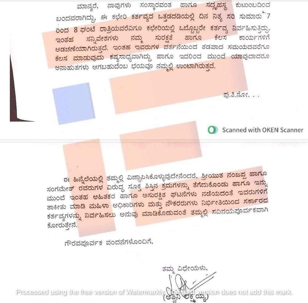 ‘ನಾವುಗಳು ಸಂಸ್ಕಾರವಂತ ಹಾಗೂ ಸದ್ಗಹೃಸ್ಥ ಕುಟುಂಬದಿಂದ ಬಂದವರಾಗಿದ್ದು ಈ ಕಚೇರಿ ಕರ್ತವ್ಯದ ಒತ್ತಡದಡಿಯಲ್ಲಿ ದಿನನಿತ್ಯ ಸರಿ ಸುಮಾರು 7ರಿಂದ 8 ಗಂಟೆ ರಾತ್ರಿವರೆಗೂ ಕಚೇರಿಯಲ್ಲಿ ಒಬ್ಬೊಬ್ಬರೇ ಕರ್ತವ್ಯ ನಿರ್ವಹಿಸುತ್ತಿದ್ದೇವೆ. ಇಂತಹ ಸನ್ನಿವೇಶಗಳು ನಮ್ಮ ಸುರಕ್ಷತೆ ಮತ್ತು ಕೆಲಸ ಕಾರ್ಯಗಳಿಗೆ ಅಡಚಣೆಯಾಗಿರುತ್ತದೆ. ಇಂತಹವರುಗಳ ವರ್ತನೆಯಿಂದ ತಡವಾದ ಸಮಯದವರೆಗೂ ಕೆಲಸ ಮಾಡುವುದು ಕಷ್ಟ ಸಾಧ್ಯವಾಗಿದೆ. ಇದರಿಂದ ಮುಂದೆ ಯಾವುದಾದರೂ ಅನಾಹುತಗಳು ಆಗಬಹುದೆಂಬ ಭಯವೂ ನಮ್ಮಲ್ಲಿ ಉಂಟಾಗಿದೆ,’ ಎಂದು ದೂರಿನಲ್ಲಿ ಅಳಲು ತೋಡಿಕೊಂಡಿರುವುದು ಗೊತ್ತಾಗಿದೆ.