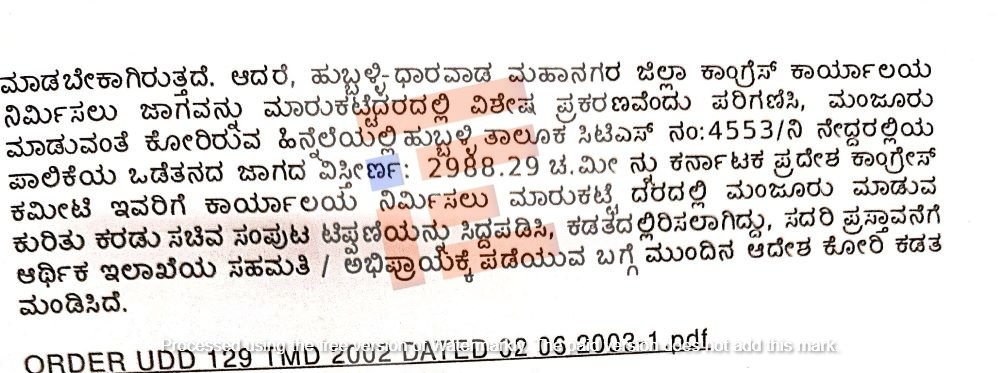 ಆದರೆ ಈ ಪ್ರಸ್ತಾವಿತ ವಿಷಯಕ್ಕೆ ಪಾಲಿಕೆಯ ಕೌನ್ಸಿಲ್‌ ಸಭೆಯಲ್ಲಿ ಅನುಮೋದನೆ ಆಗಿಲ್ಲ. ಜಿಲ್ಲಾ ಉಸ್ತುವಾರಿ ಸಚಿವ ಸಂತೋಷ್‌ ಲಾಡ್ ಅವರು ಧಾರವಾಡ ಜಿಲ್ಲಾ ಕಾಂಗ್ರೆಸ್‌ ಕಾರ್ಯಾಲಯ ನಿರ್ಮಾಣ ಮಾಡುವ ಸಲುವಾಗಿ ಜಾಗವನ್ನು ಮಂಜೂರು ಮಾಡಲು ಪ್ರಸ್ತಾವನೆ ಸಲ್ಲಿಸಿದ್ದಾರೆ. ಇದಕ್ಕೆ ತಗುಲುವ ವೆಚ್ಚವನ್ನು ಈಗಿನ ಸರ್ಕಾರದ ದರ ಅಥವಾ ಅದಕ್ಕಿಂತ ಕಡಿಮೆ ಬೆಲೆಯನ್ನು ಭರಿಸಲು ಸಿದ್ಧರಿದ್ದೇವೆ ಎಂದು ತಿಳಿಸಿದ್ದಾರೆ. ಇದನ್ನು ಒಂದು ವಿಶೇಷ ಪ್ರಕರಣವೆಂದು ಪರಿಗಣಿಸಿ ಪ್ರಸ್ತಾವನೆಯನ್ನು ಸಚಿವ ಸಂಪುಟದ ಅನುಮೋದನೆಗೆ ಮಂಡಿಸಲು ಸೂಚಿಸಿದ್ದಾರೆ ಎಂದು ಪೌರಾಡಳಿತ ನಿರ್ದೇಶನಾಲಯದ ನಿರ್ದೇಶಕರು ಟಿಪ್ಪಣಿ ಹಾಳೆಯಲ್ಲಿ ಉಲ್ಲೇಖಿಸಿರುವುದು ತಿಳಿದು ಬಂದಿದೆ.