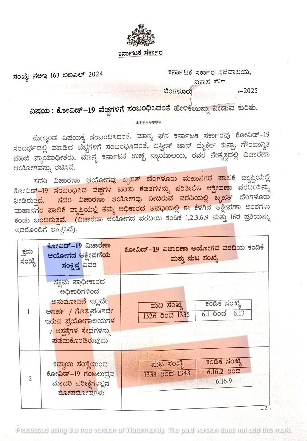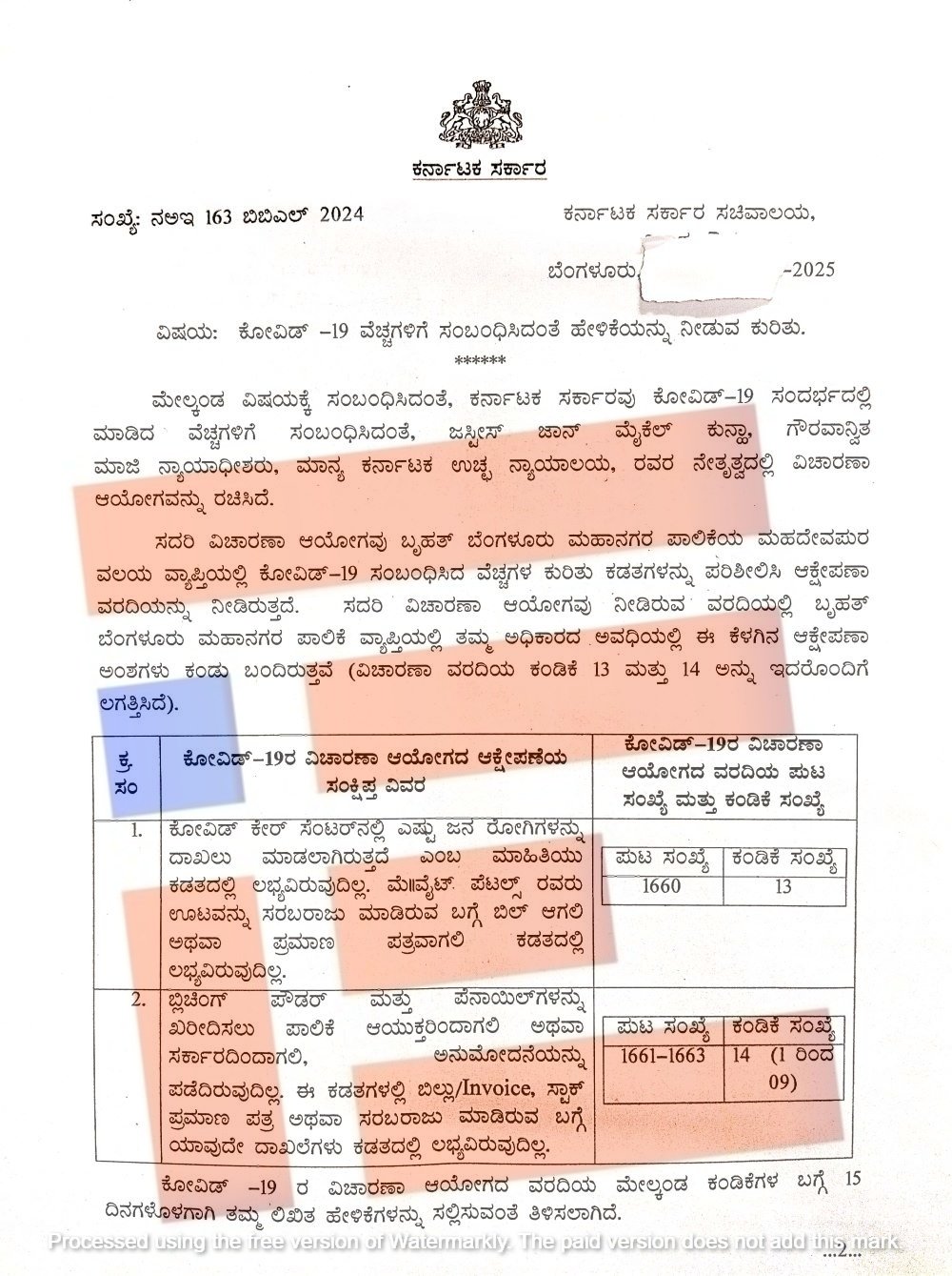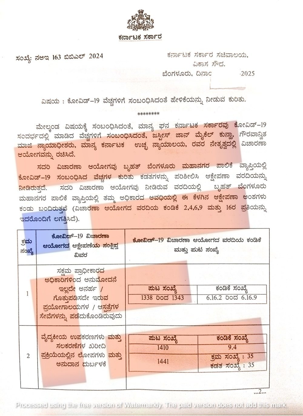 ಕೋವಿಡ್‌ 19ರ ಕುರಿತು ವಿಚಾರಣೆ ವರದಿಯ ಈ ಕಂಡಿಕೆಗಳ ಬಗ್ಗೆ 15 ದಿನದೊಳಗಾಗಿ ಲಿಖಿತ ಹೇಳಿಕೆಗಳನ್ನು ಸಲ್ಲಿಸಬೇಕು ಎಂದು ನಗರಾಭಿವೃದ್ಧಿ ಇಲಾಖೆಯ ಸರ್ಕಾರದ ಹೆಚ್ಚುವರಿ ಮುಖ್ಯ ಕಾರ್ಯದರ್ಶಿ ಎಸ್‌ ಆರ್ ಉಮಾಶಂಕರ್ ಅವರು ಸೂಚಿಸಿರುವುದು ಪತ್ರದಿಂದ ಗೊತ್ತಾಗಿದೆ.